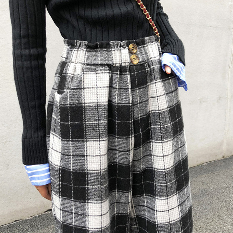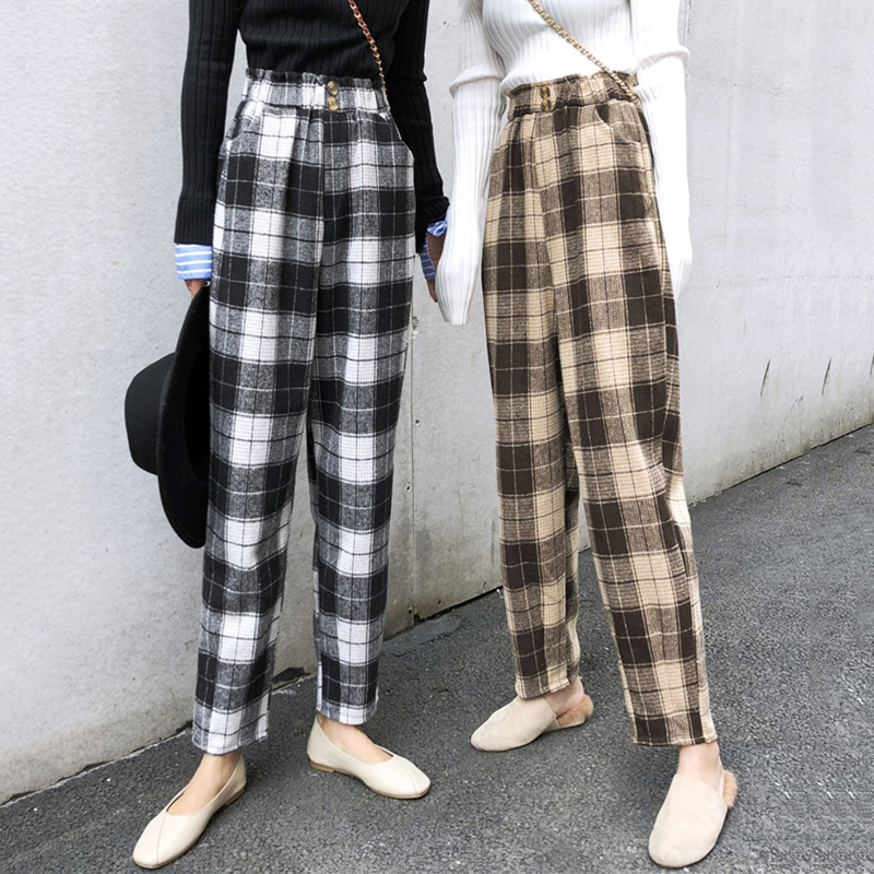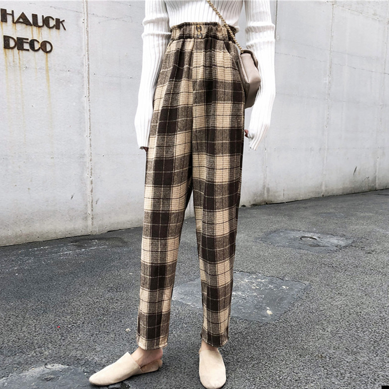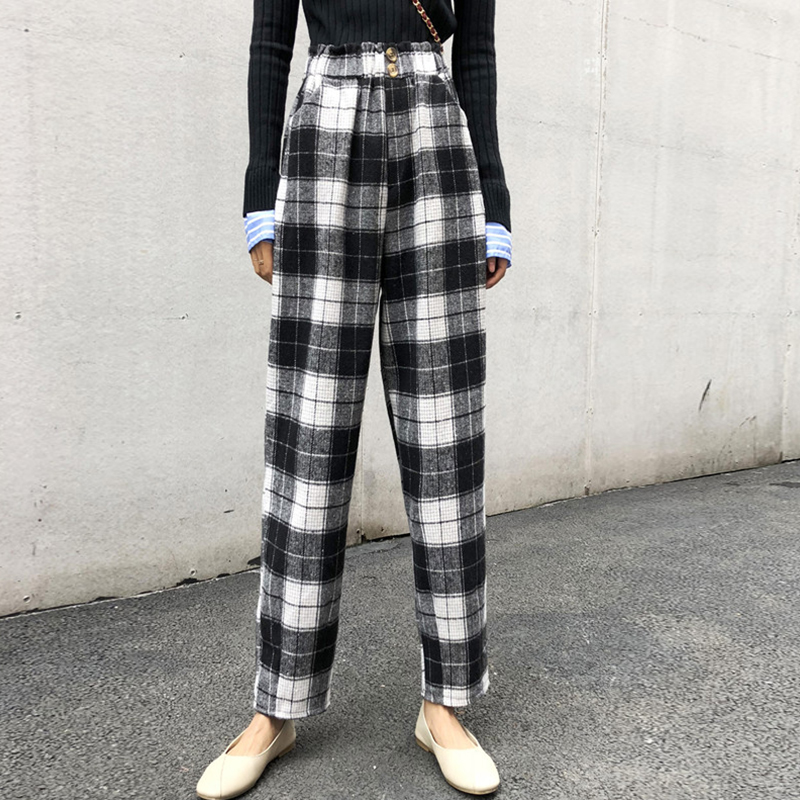 / 學生毛呢寬松哈倫休閑長褲女秋冬裝新款高腰顯瘦復古風格子蘿卜褲