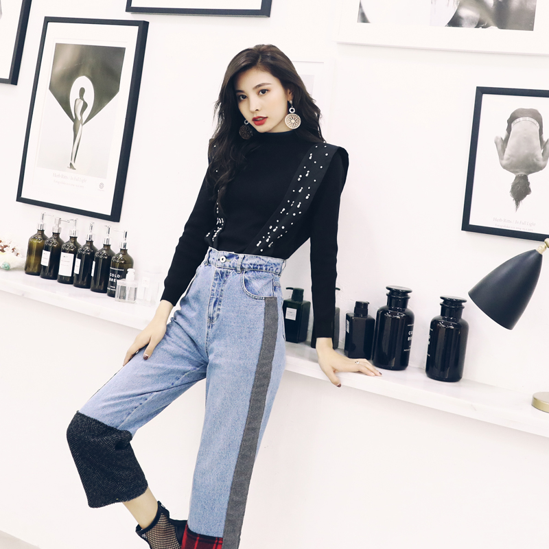 名媛氣質秋裝女2018新款針織衫上衣高腰拼接牛仔背帶褲九分褲套裝