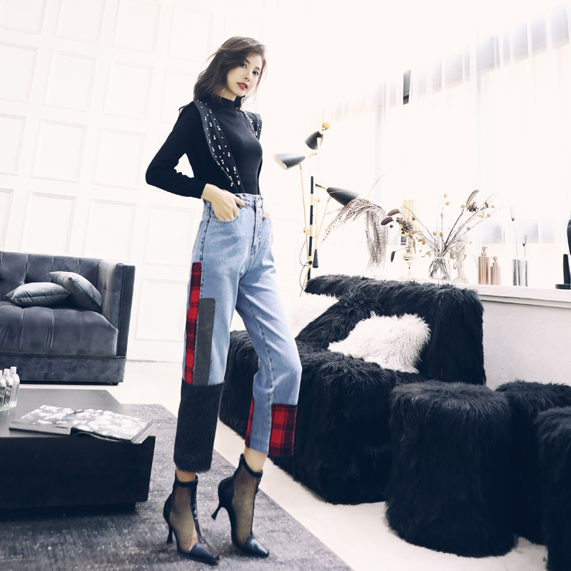 / 名媛氣質秋裝女2018新款針織衫上衣高腰拼接牛仔背帶褲九分褲套裝