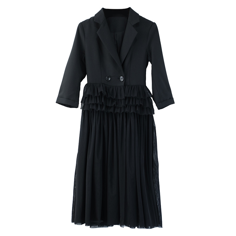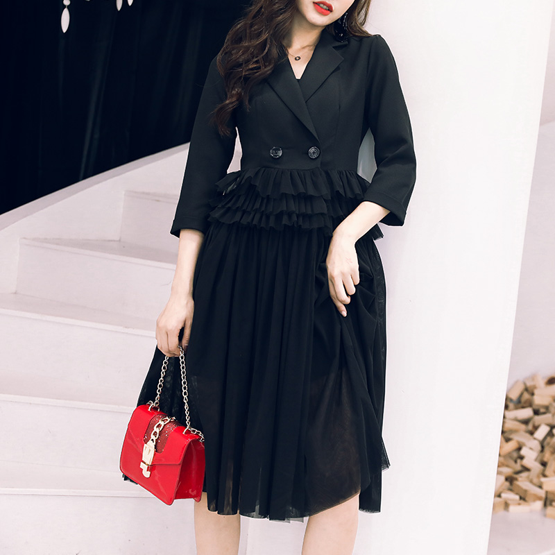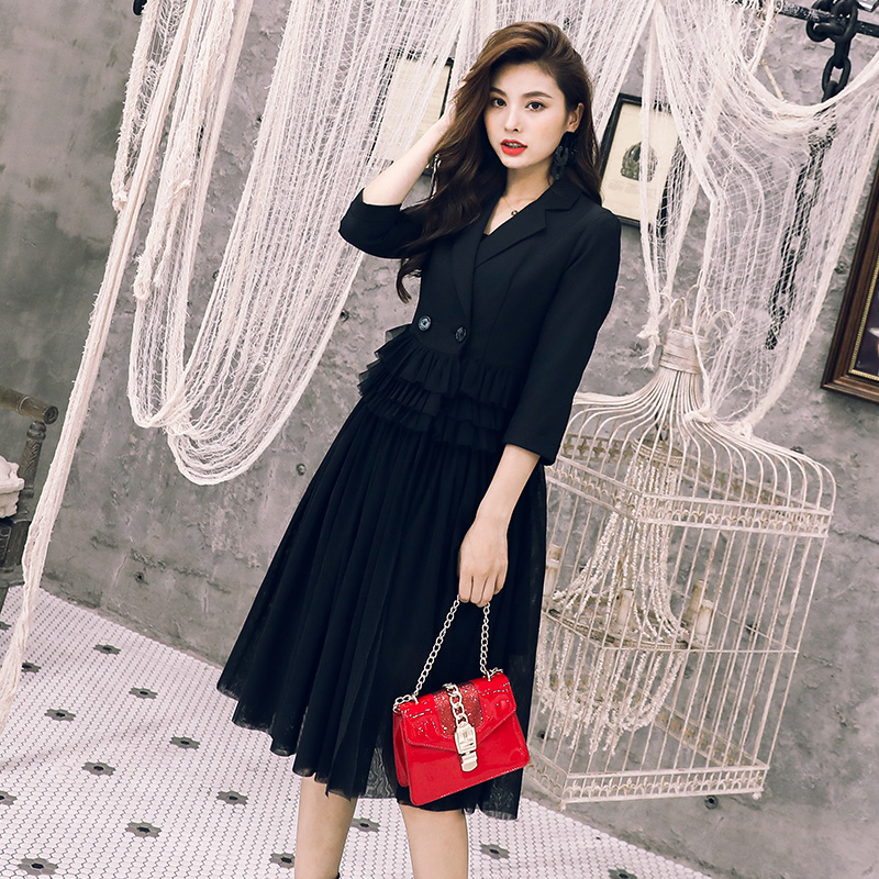 / 名媛氣質2018秋裝新款時尚休閑個性西裝外套拼接網紗顯瘦連衣裙女