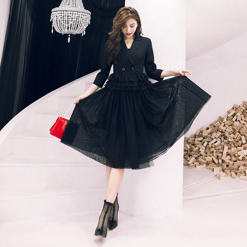 名媛氣質2018秋裝新款時尚休閑個性西裝外套拼接網紗顯瘦連衣裙女