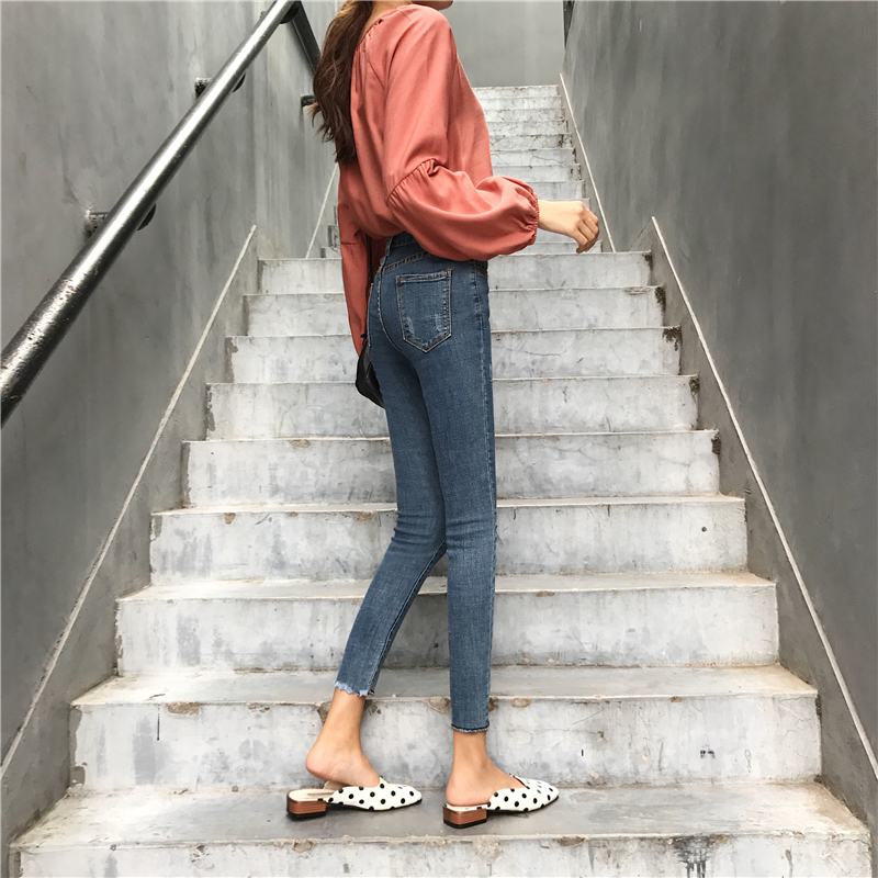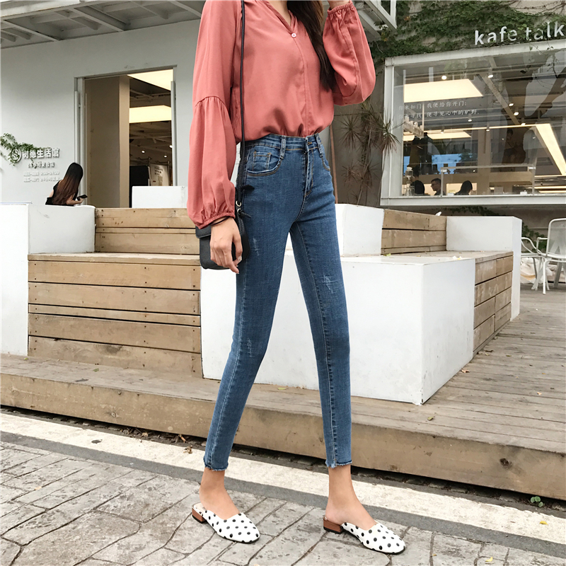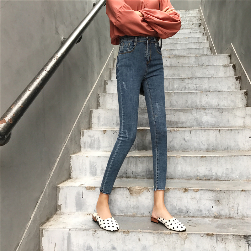 時尚復古彈力高腰修身九分水洗牛仔褲女春秋2018新款韓版顯瘦褲子