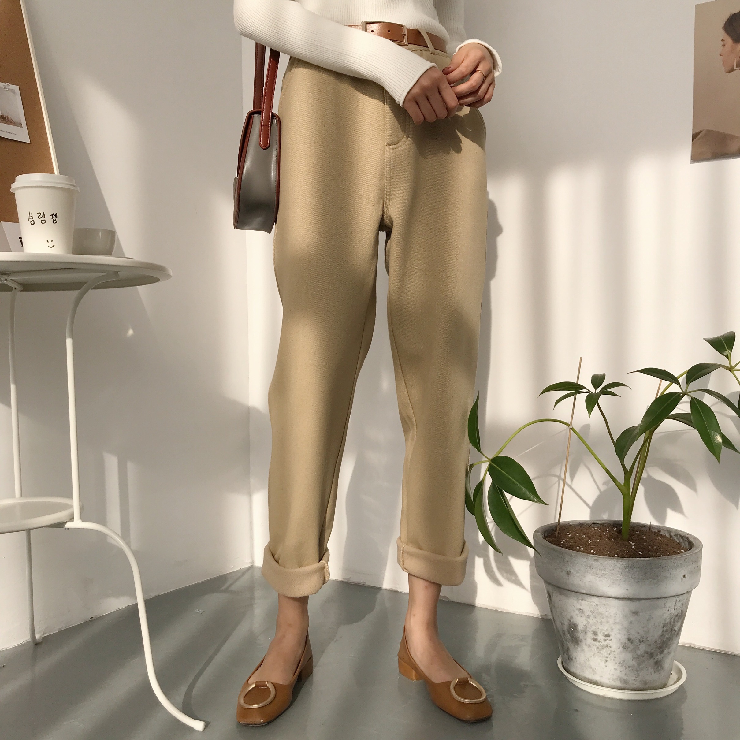 / 韓風chic秋冬季新款簡約純色顯瘦高腰加絨保暖休閑長褲女配皮帶潮