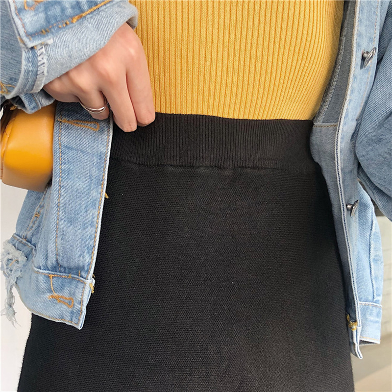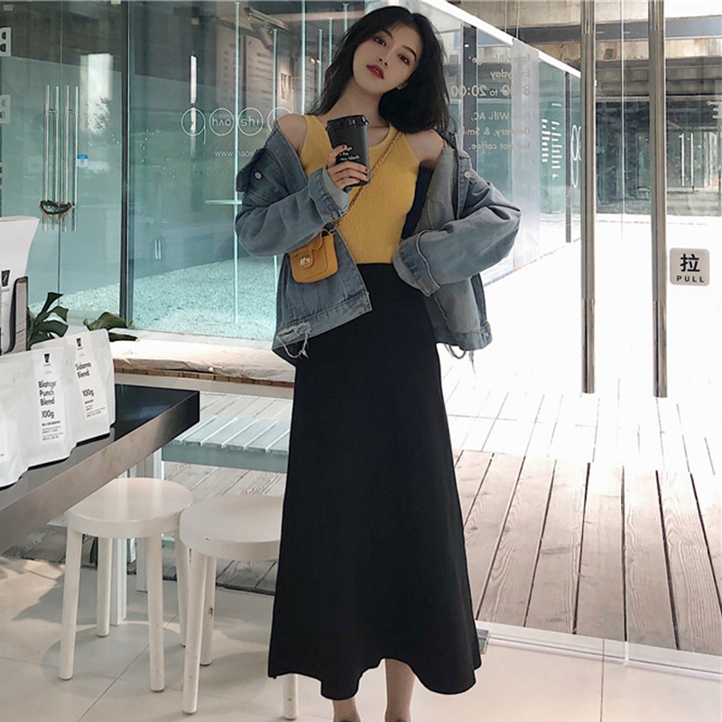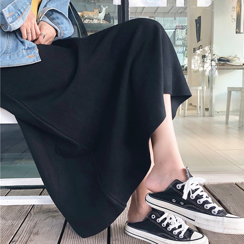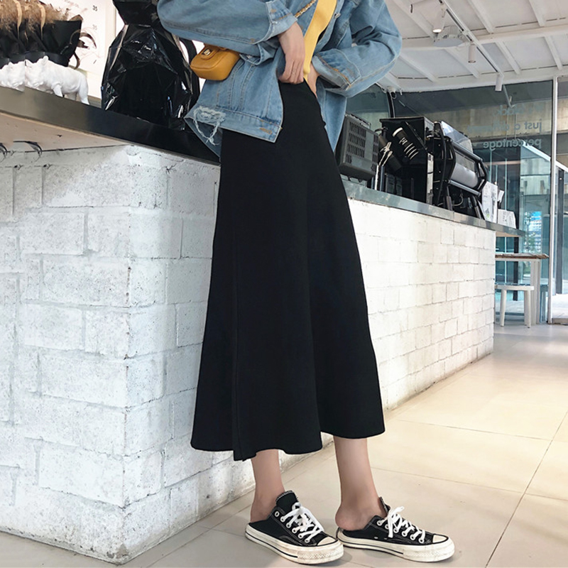/ 針織半身裙女秋裝新款復古港風高腰中長裙學生簡約氣質A字黑裙子