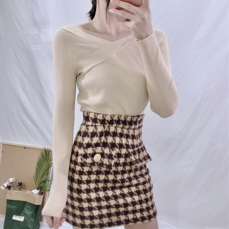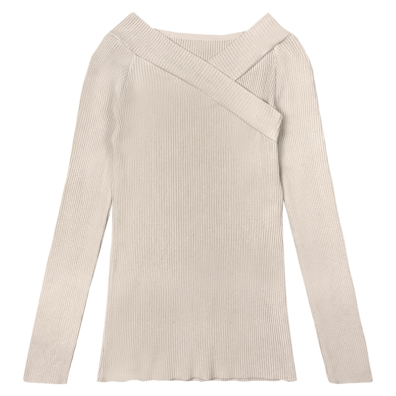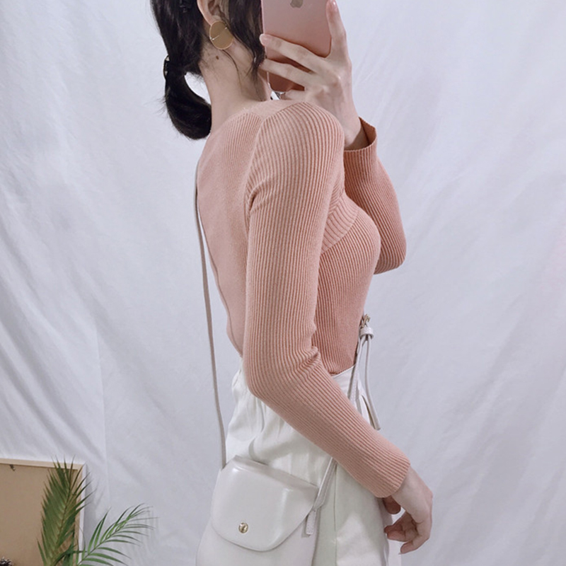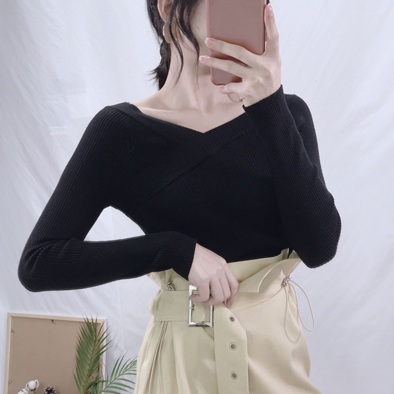 糖果色露肩V領針織衫秋裝女2018新款韓版修身顯瘦打底衫長袖上衣