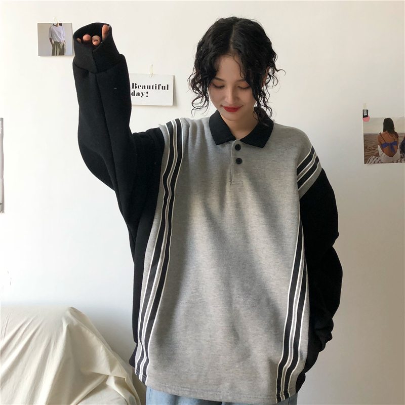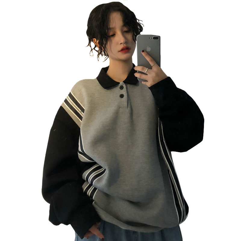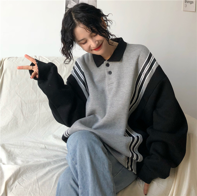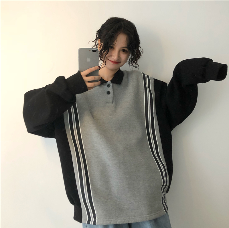 / 秋冬韓版中長款原宿風寬松polo領加絨加厚拼接套頭超火衛衣外套女