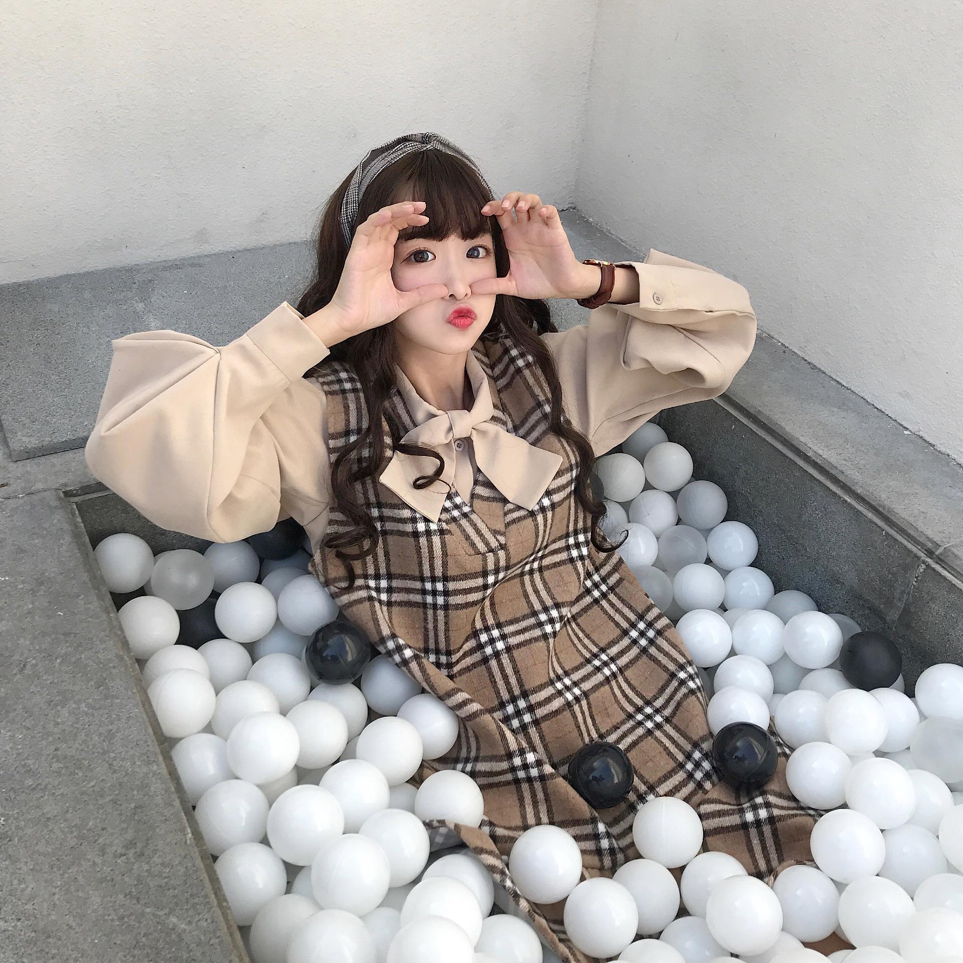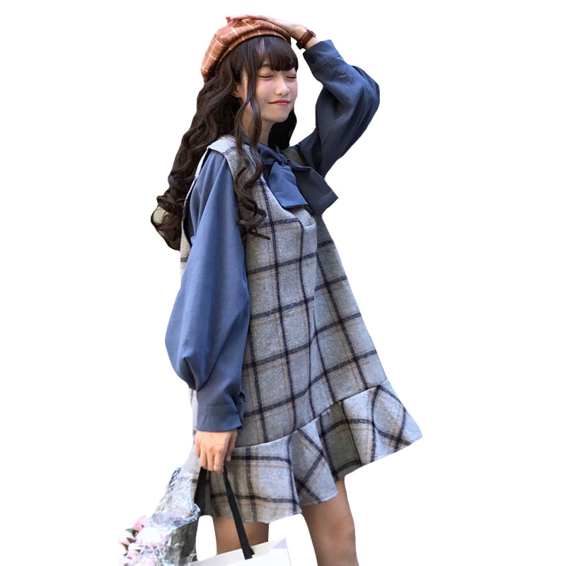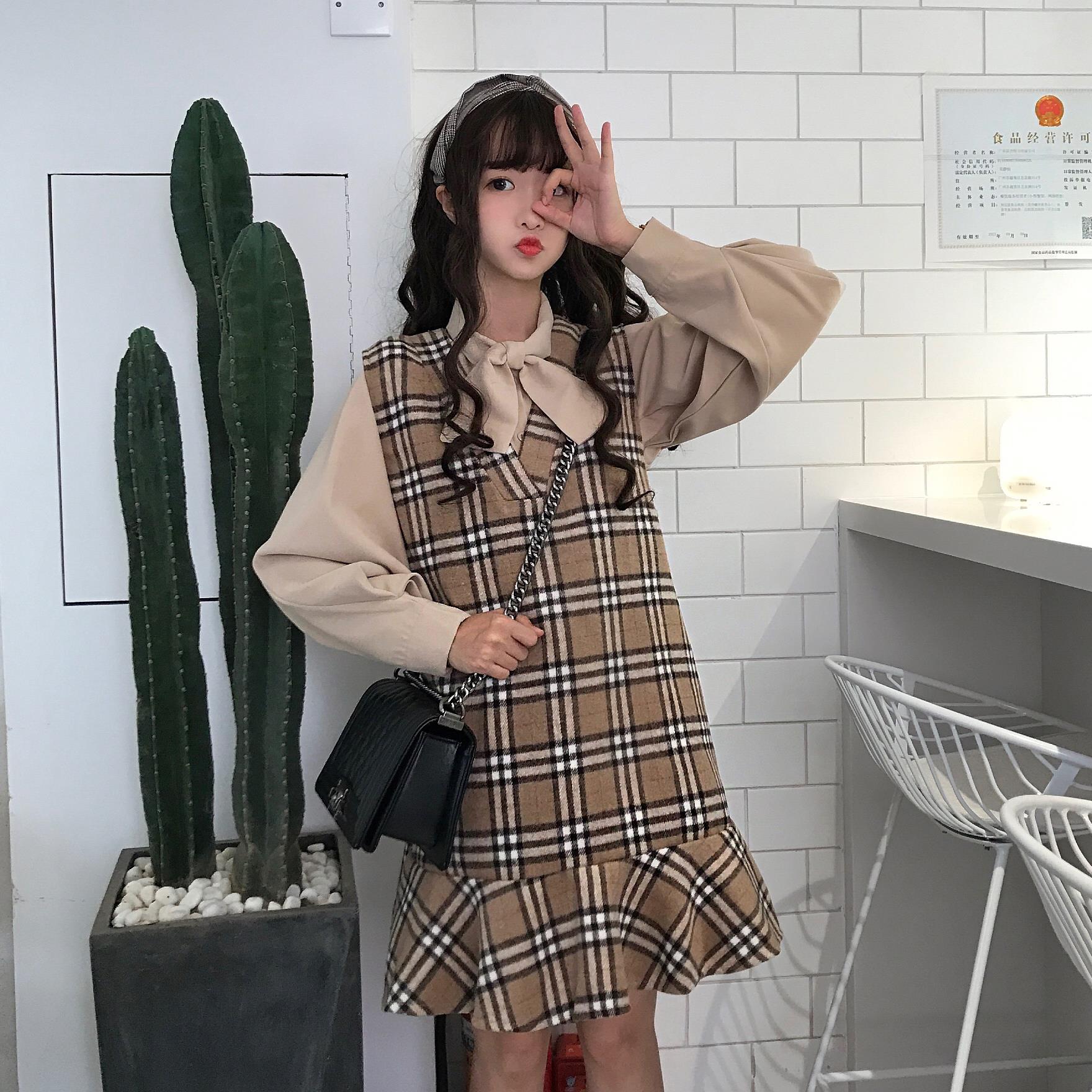 / 韓版時尚休閑套裝秋冬V領寬松格紋荷葉邊背心裙+打底襯衣兩件套女