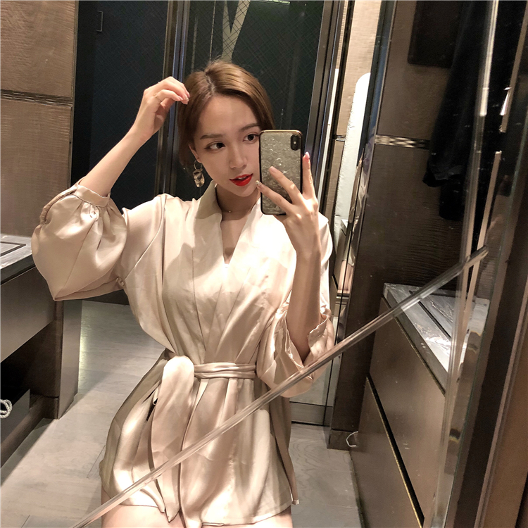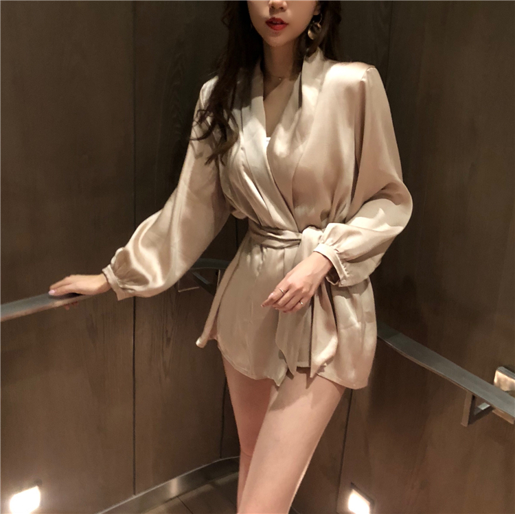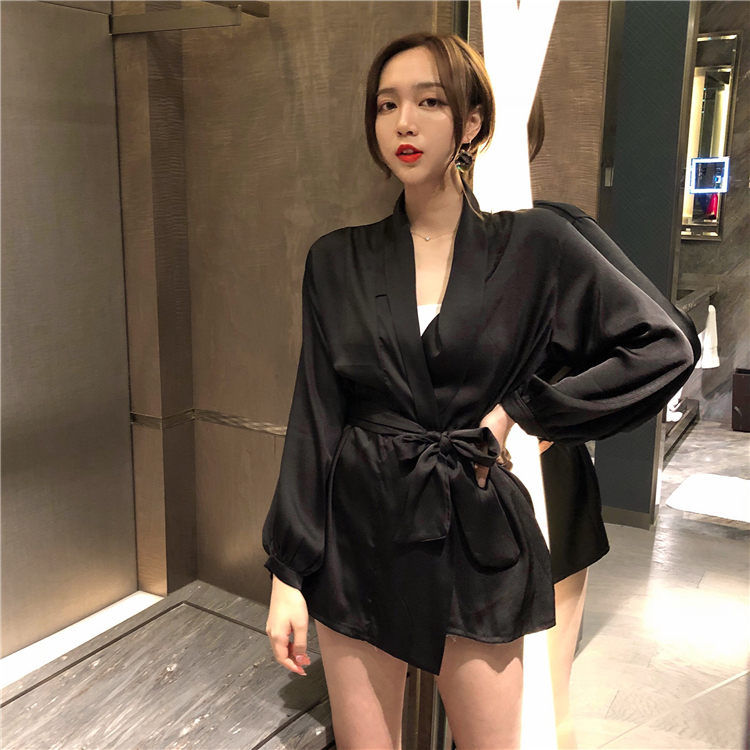 / 新款韓版港風時尚百搭復古chic寬松開衫純色秋裝氣質長袖系帶襯衣