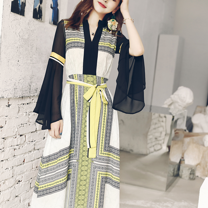 名媛氣質溫柔裙超仙收腰顯瘦喇叭袖復古印花長袖中長款高腰連衣裙