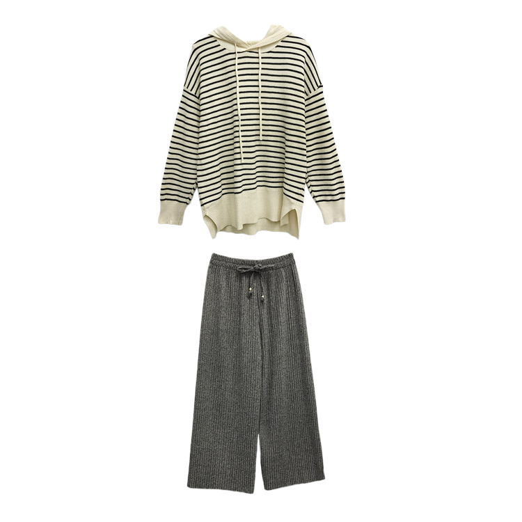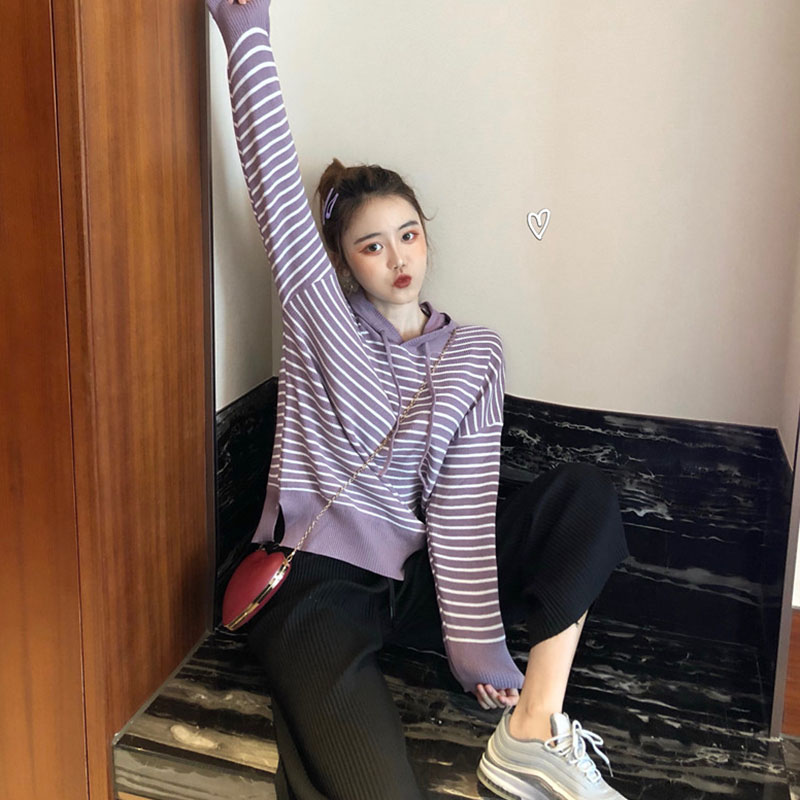 秋裝女2018新款軟糯連帽條紋毛衣女+慵懶風舒適闊腿褲(加厚版)