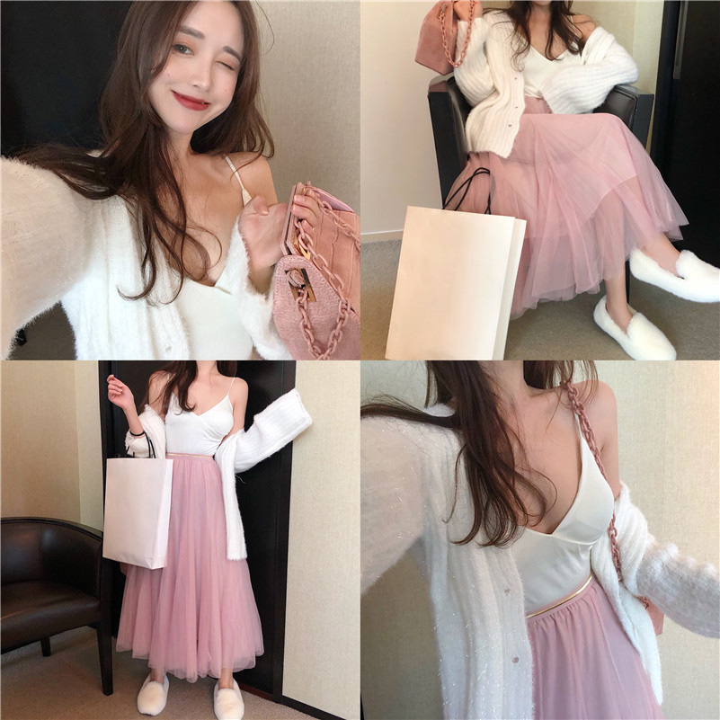 / 寬松白色網紅毛衣甜美小清新開衫韓版時尚套裝網紗裙子chic兩件套