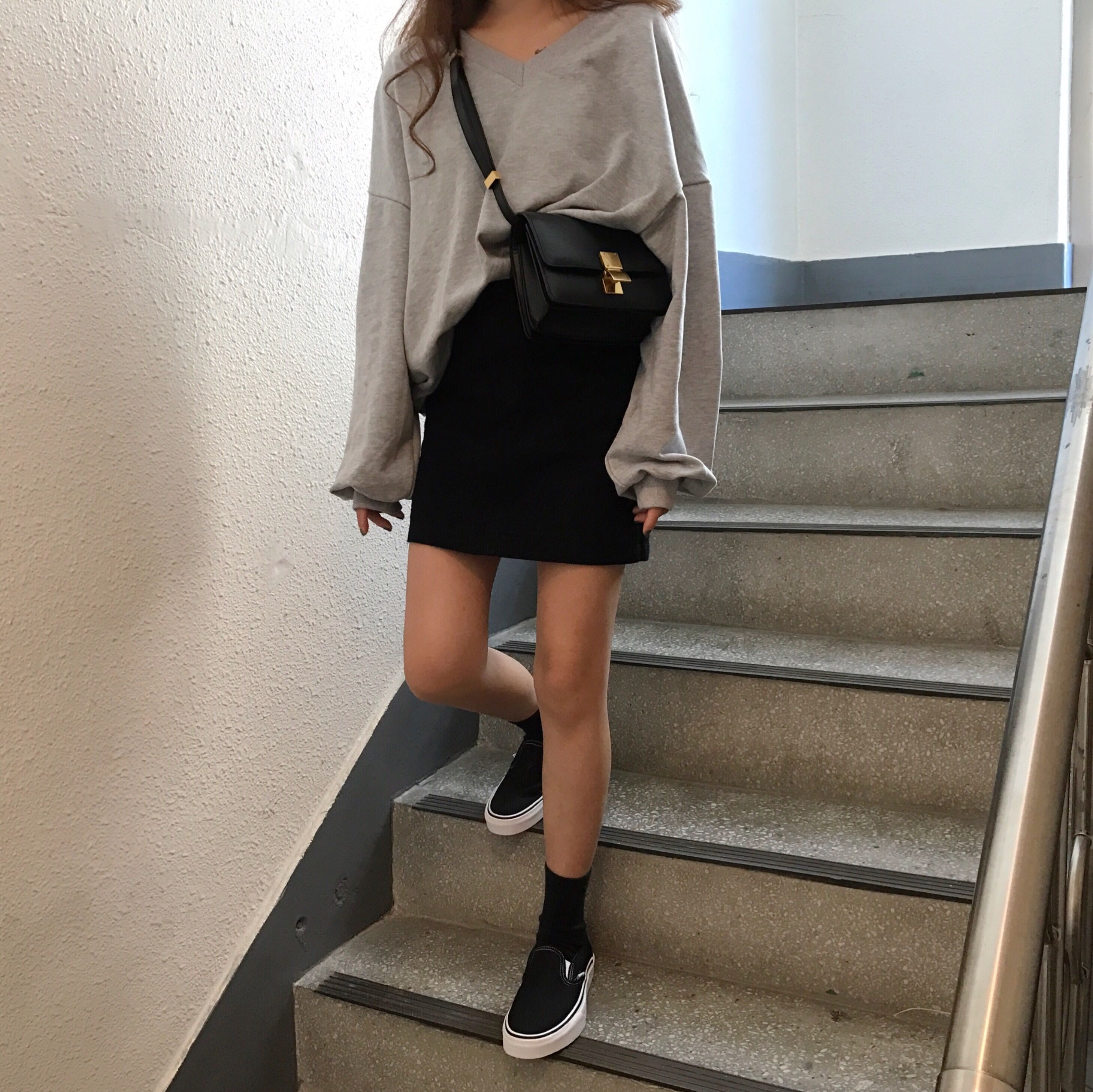 / 早秋衛衣2018新款女長袖韓版簡約主義氣質寬松V領漏肩蝙蝠袖上衣