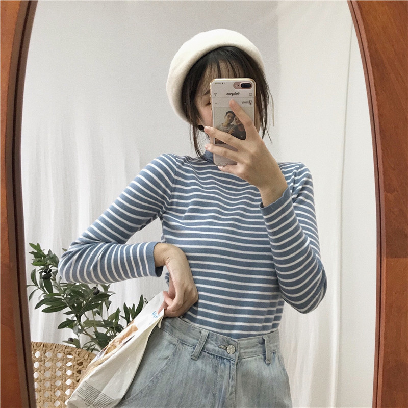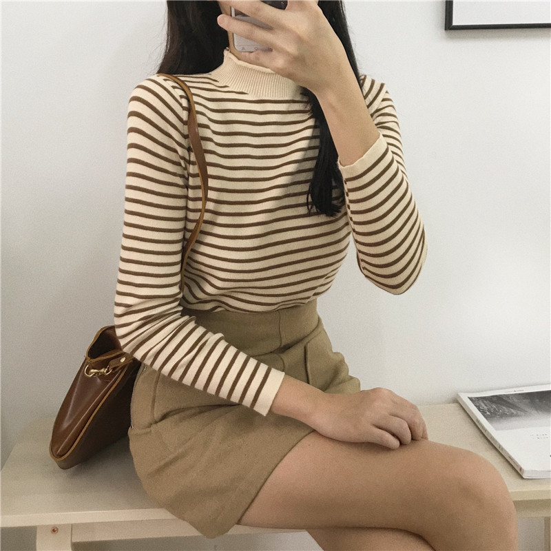 秋冬韓版修身顯瘦半高領卷邊條紋網紅套頭打底衫針織衫毛衣上衣女