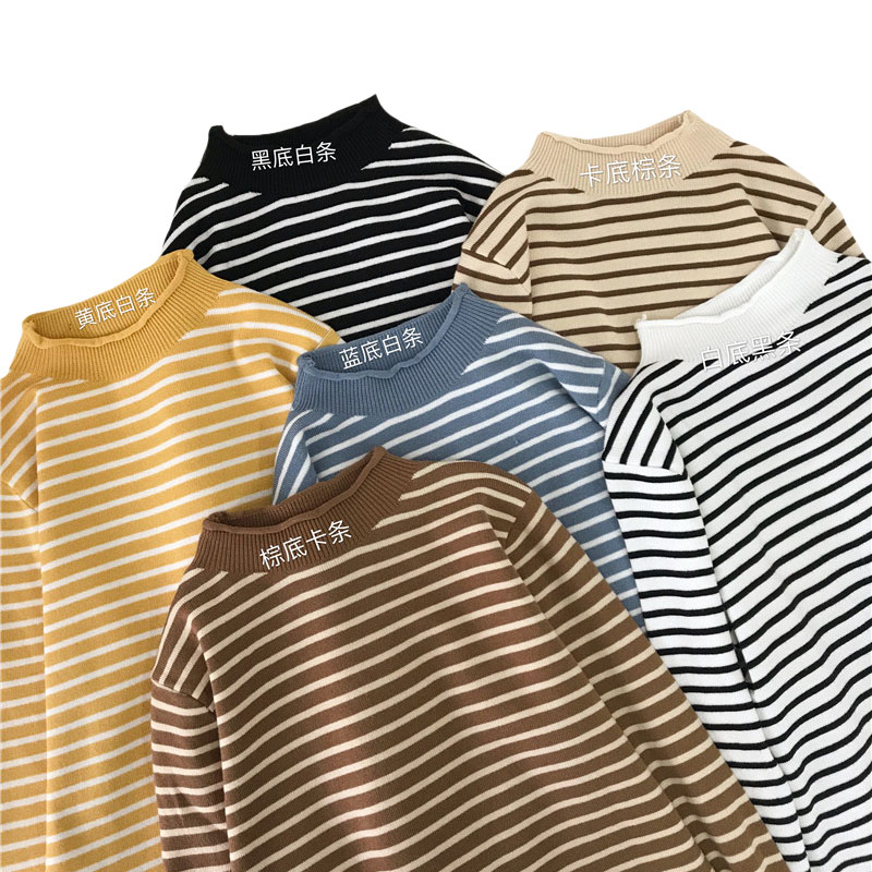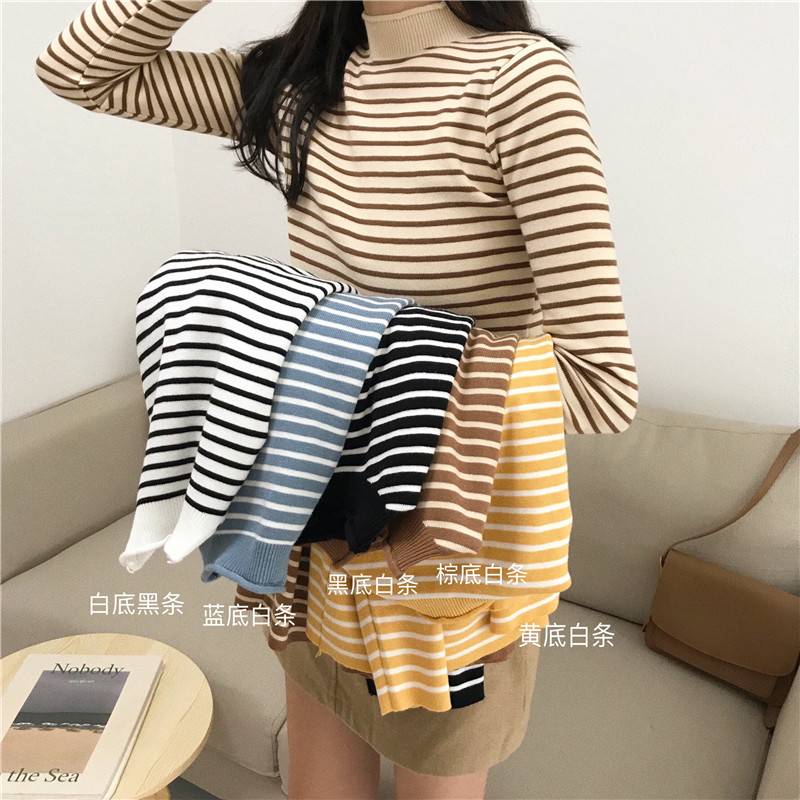 / 秋冬韓版修身顯瘦半高領卷邊條紋網紅套頭打底衫針織衫毛衣上衣女