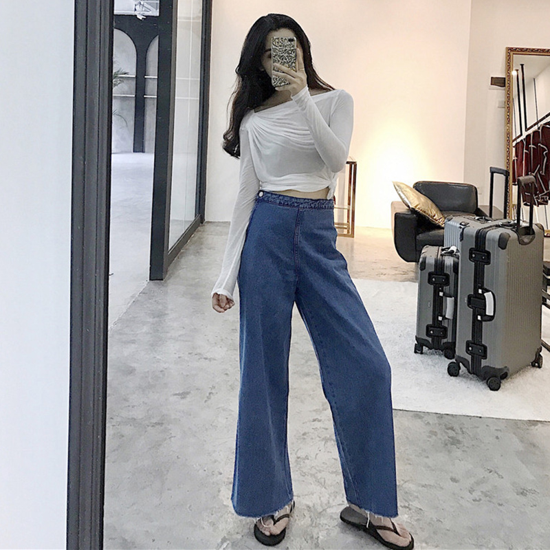 港味復古韓國chic風復古顯瘦淺色撕邊牛仔褲高腰百搭休閑闊腿褲女