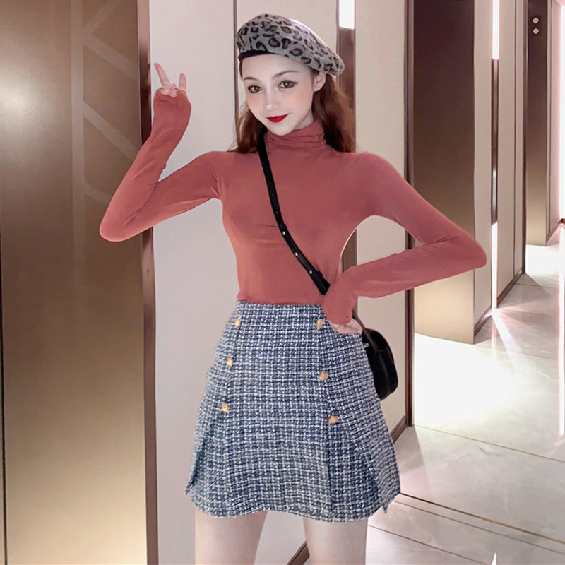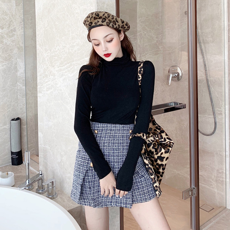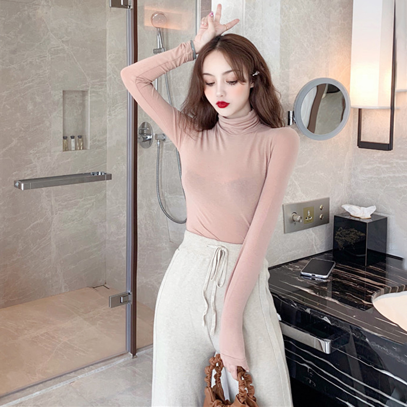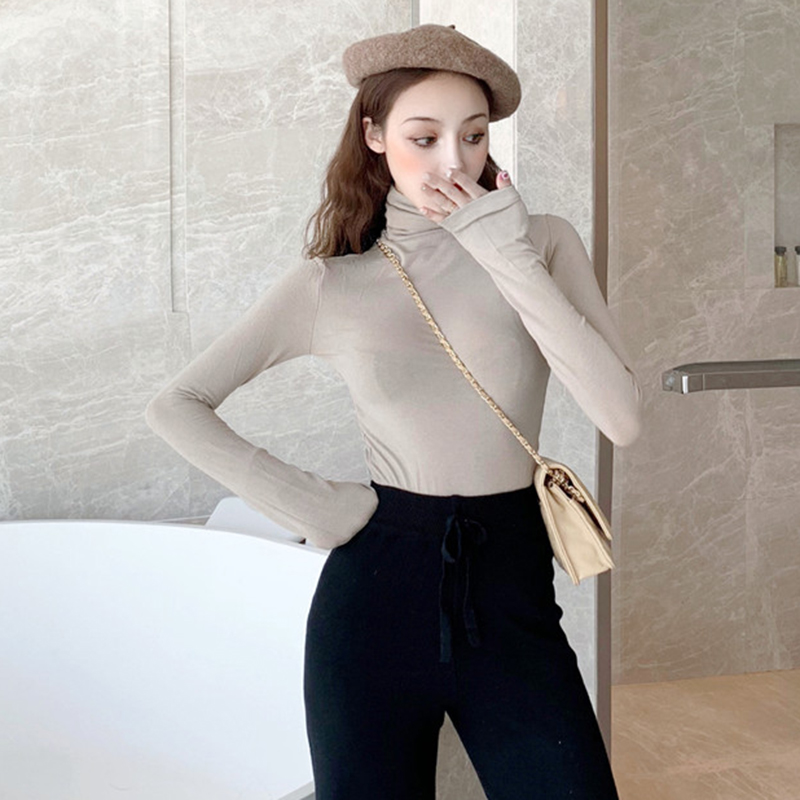 港味復古chic上衣秋裝新款修身高領長袖T恤緊身純色打底衫女學生