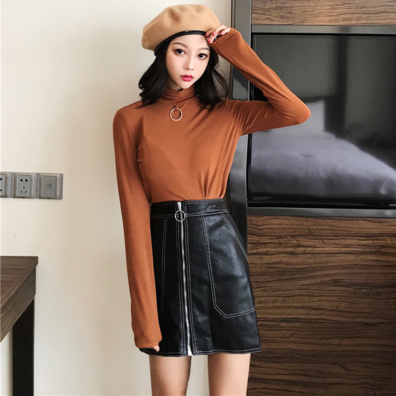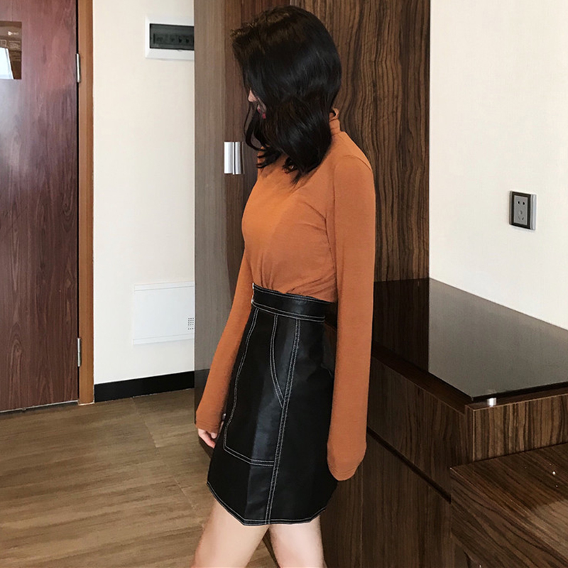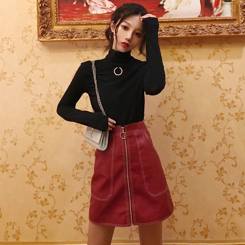 御姐套裝女秋冬新款高領修身黑色長袖打底衫T恤顯瘦PU皮半身裙子