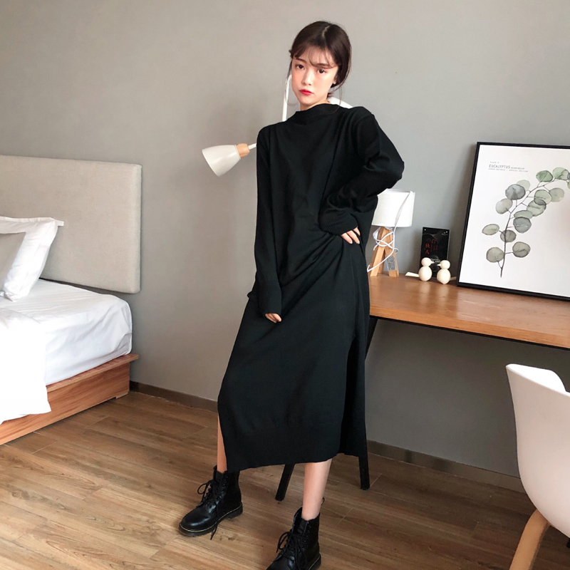 / 秋季女裝韓版中長款慵懶風長袖針織衫寬松外穿套頭開叉毛衣連衣裙