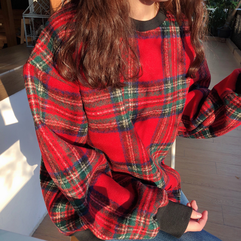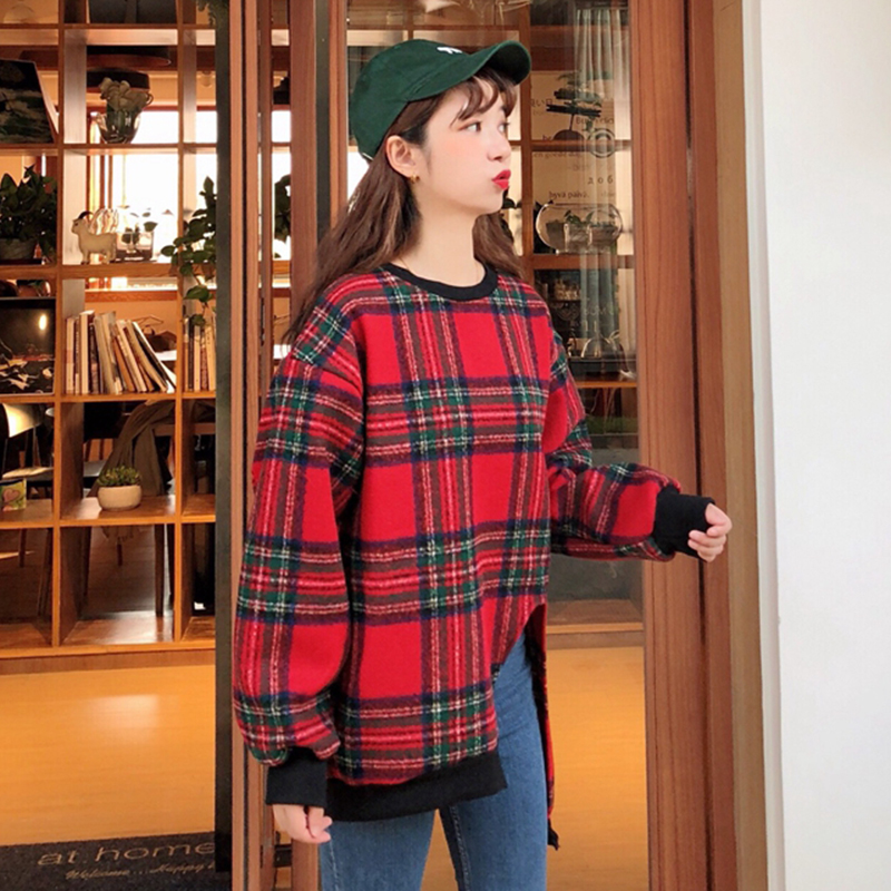 秋冬女裝2018新款寬松長袖前短后長格子套頭毛呢衛衣學生上衣外套