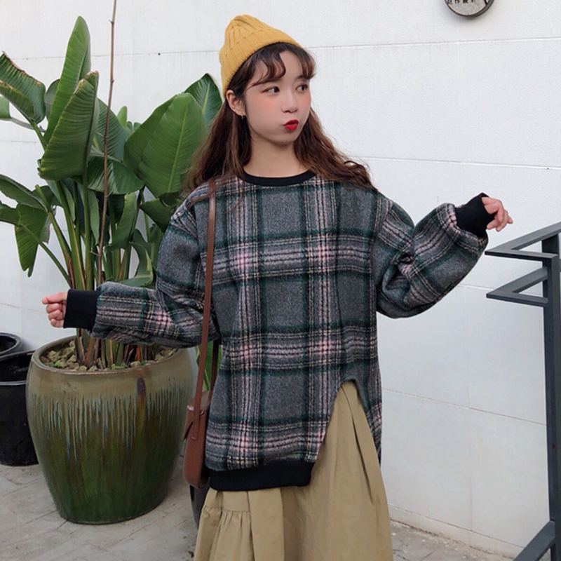 / 秋冬女裝2018新款寬松長袖前短后長格子套頭毛呢衛衣學生上衣外套