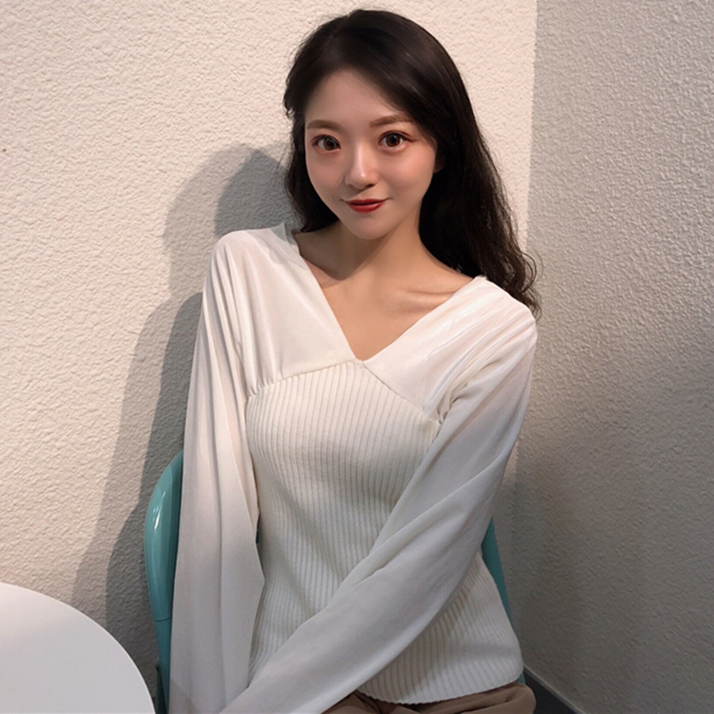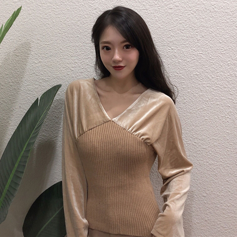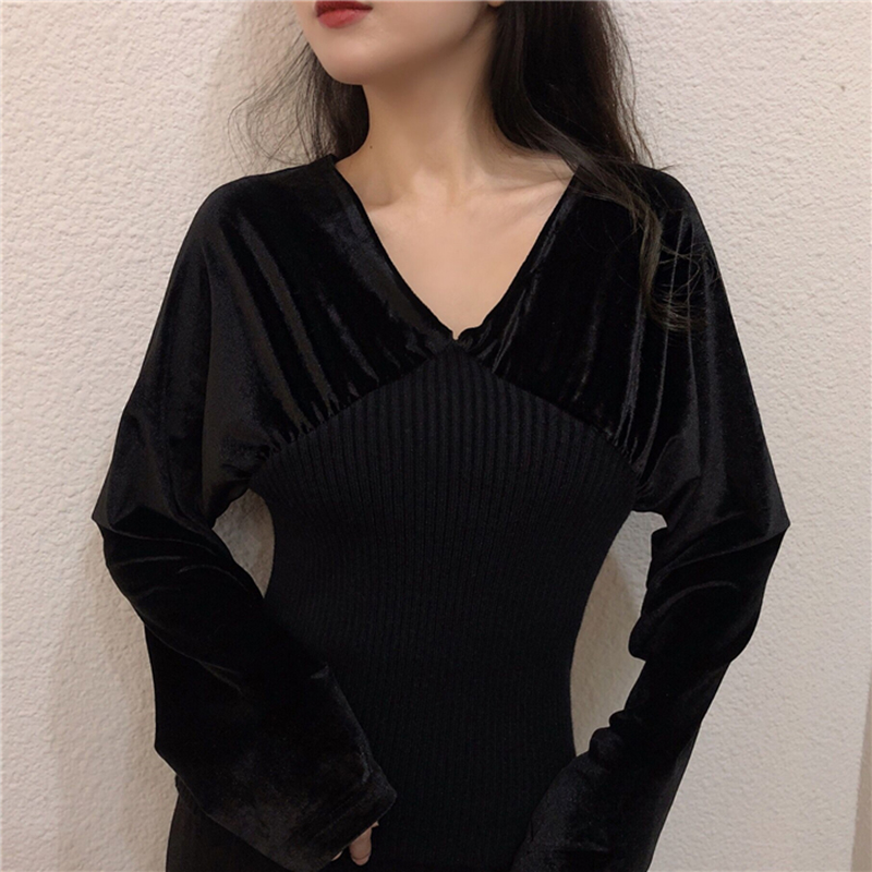 / V領修身顯瘦打底衫女秋冬裝新款學生長袖針織拼接絲絨上衣黑色T恤