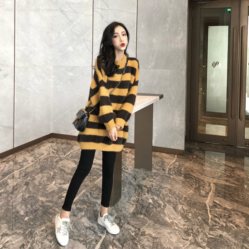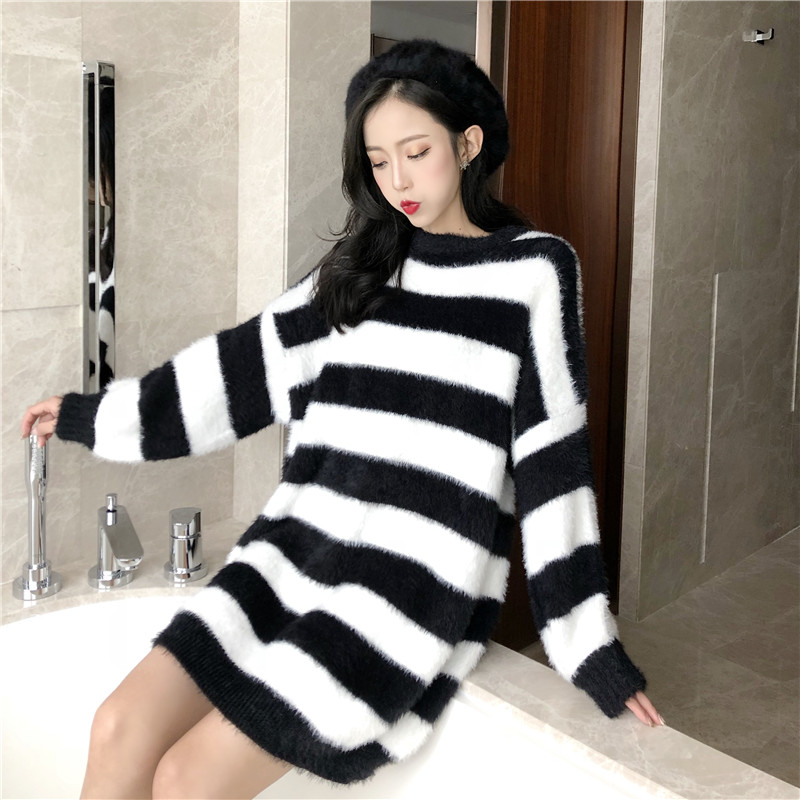 / 韓版寬松慵懶馬海毛毛衣女2018新款秋冬套頭水貂絨中長款毛衣裙女
