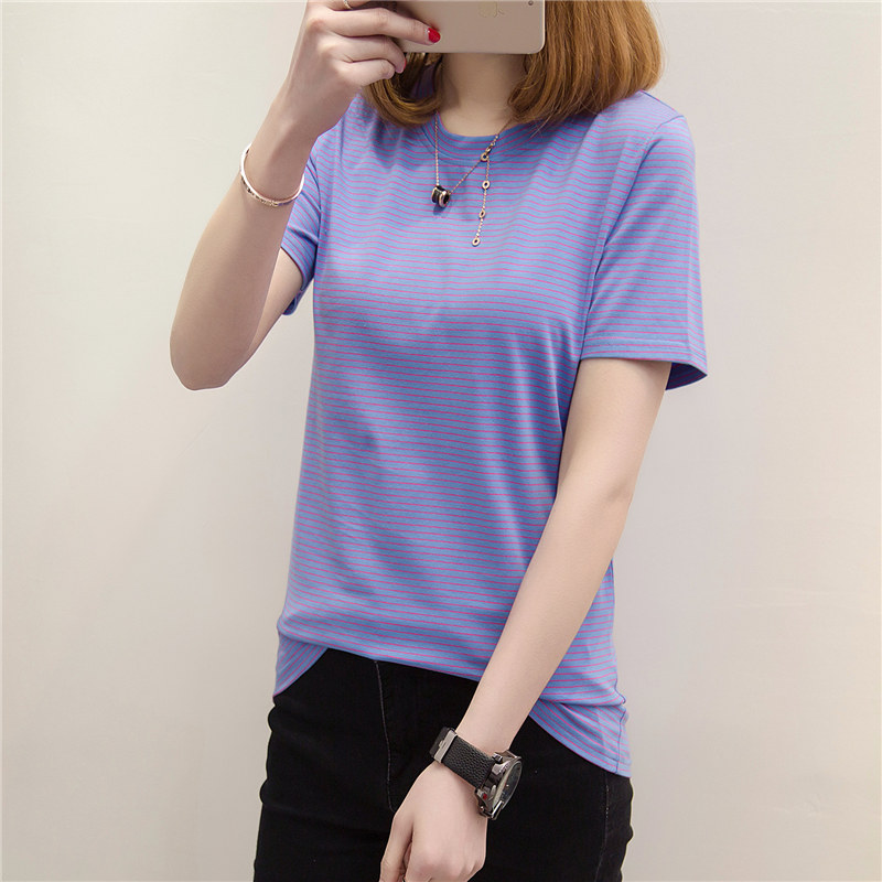 / 春裝新款女打底衫長款時尚條紋短袖t恤女寬松韓版百搭上衣潮