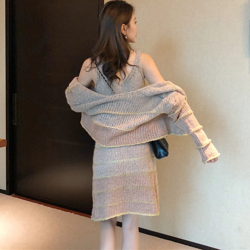 / 赫本套裝女秋冬新款慵懶長袖針織開衫短外套修身顯瘦吊帶連衣裙子