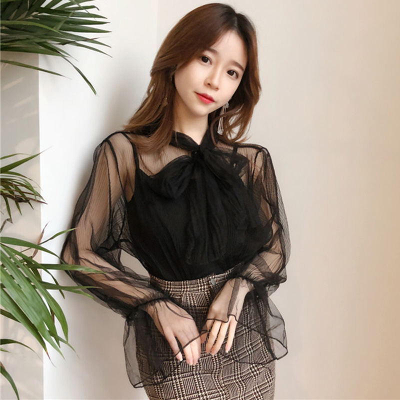 / 早春新款女裝短款吊帶背心+薄款透視系帶蝴蝶結網紗上衣學生套裝