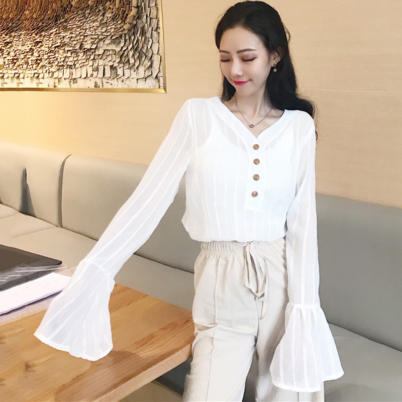 / 早秋新款韓版女裝修身排扣V領喇叭長袖仙氣質雪紡白襯衫顯瘦上衣