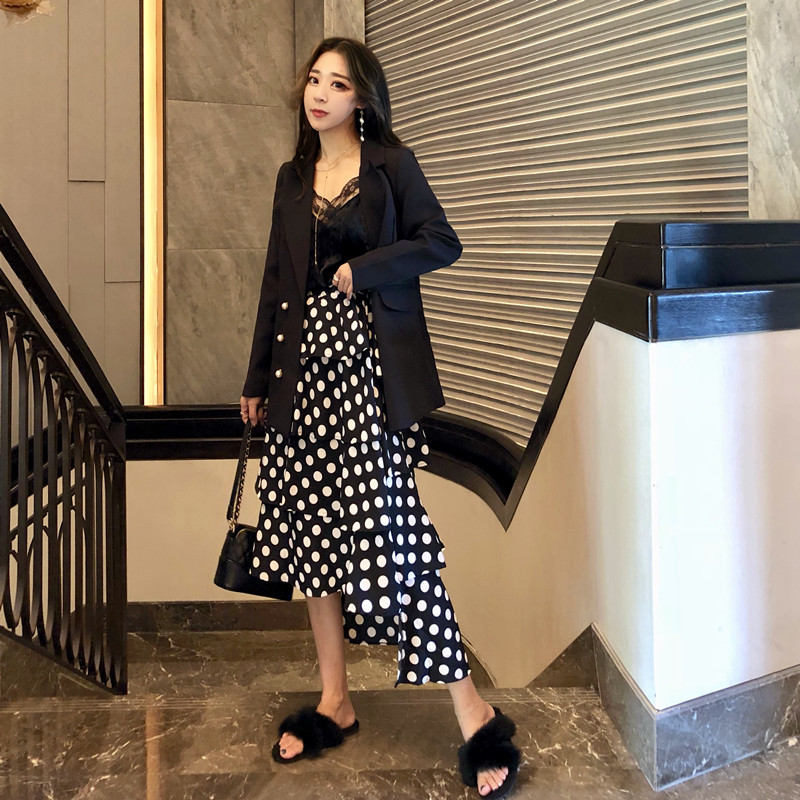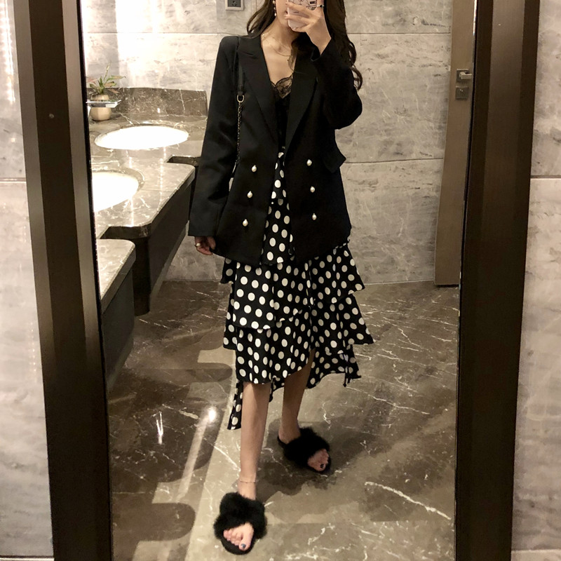 2018秋裝新款韓版套裝女珍珠扣西裝外套前短后長波點蛋糕裙兩件套