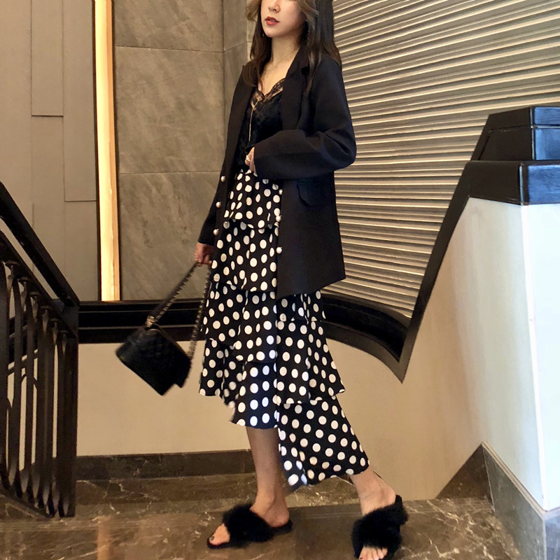 / 2018秋裝新款韓版套裝女珍珠扣西裝外套前短后長波點蛋糕裙兩件套