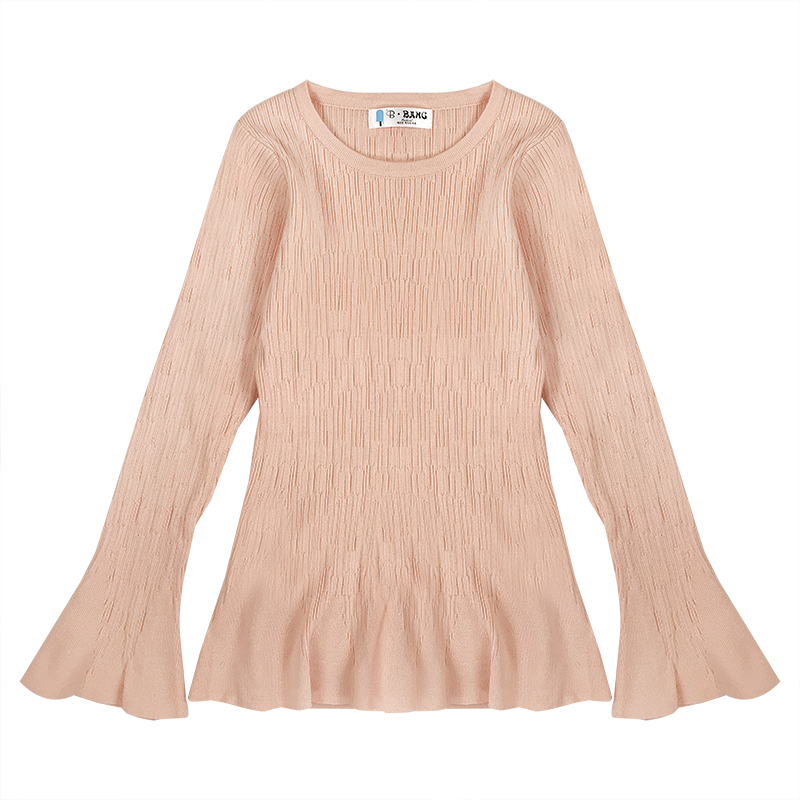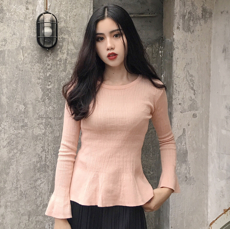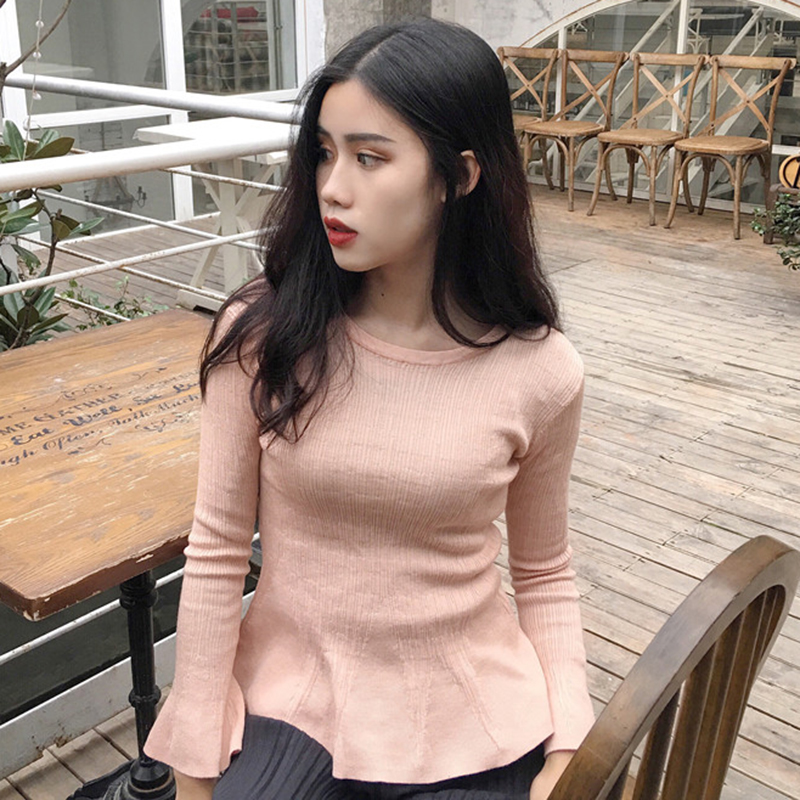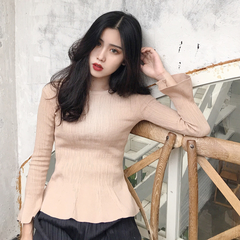 / 喇叭長袖修身顯瘦打底針織衫女秋冬裝新款韓版圓領時尚薄款毛衣潮