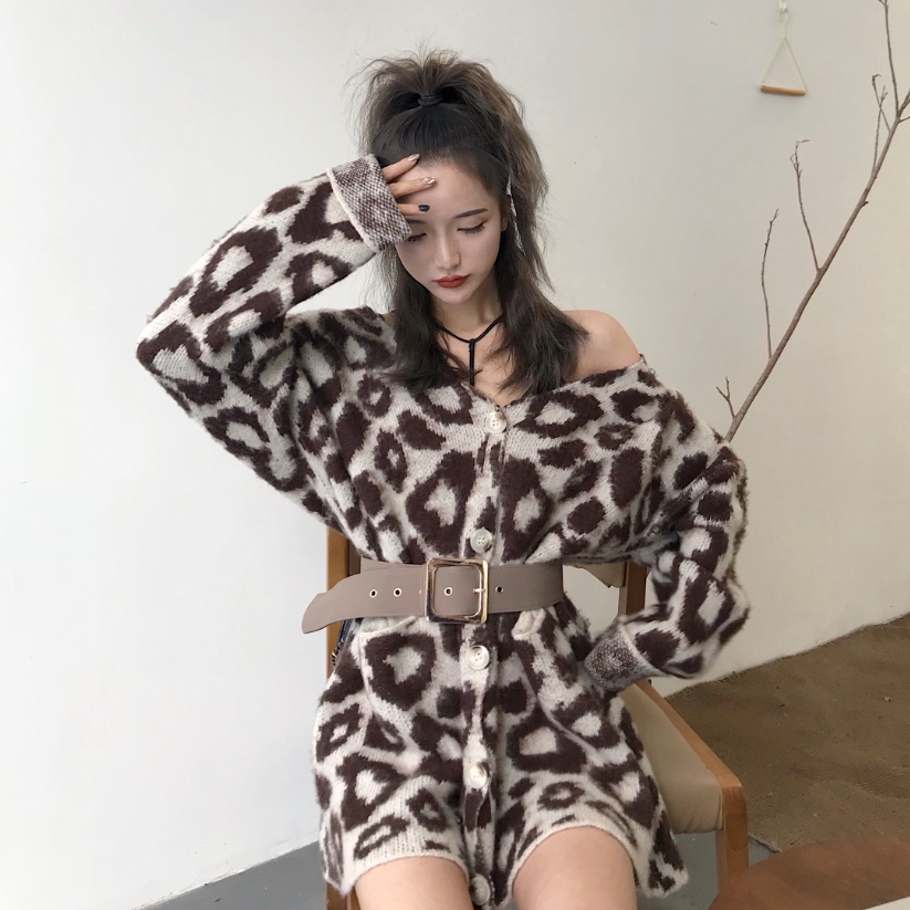 / 秋冬新款韓版加厚保暖時尚單排扣女裝豹紋網紅毛衣開衫外套配腰帶