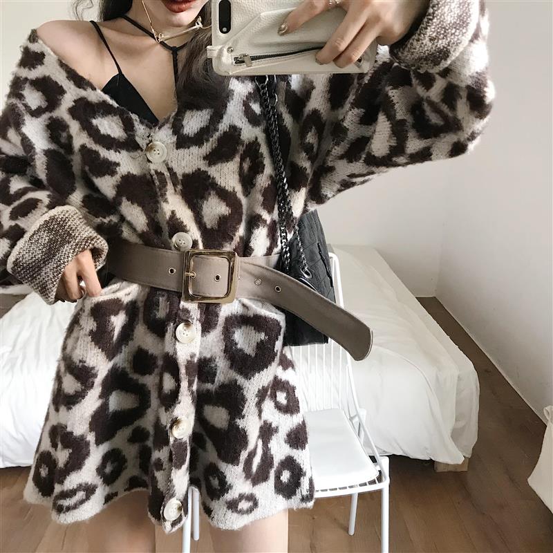 秋冬新款韓版加厚保暖時尚單排扣女裝豹紋網紅毛衣開衫外套配腰帶