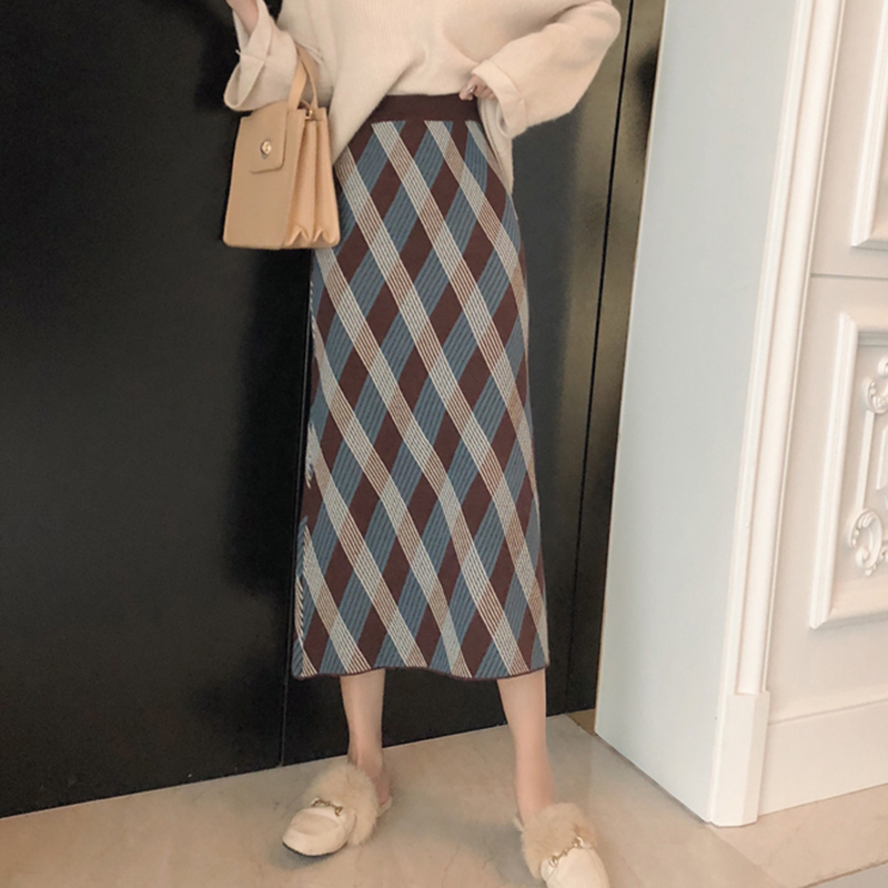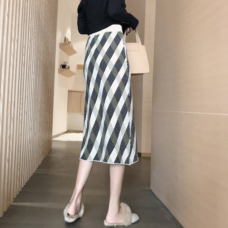 / 秋冬女裝2018新款中長款針織A字半身裙高腰修身顯瘦格紋包臀裙子