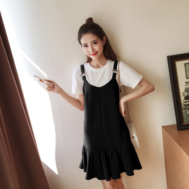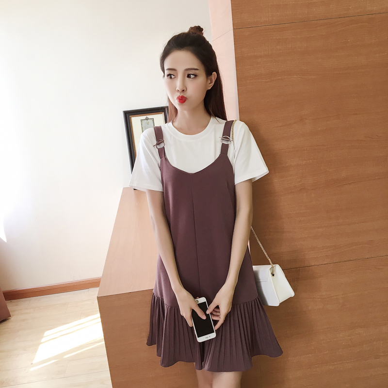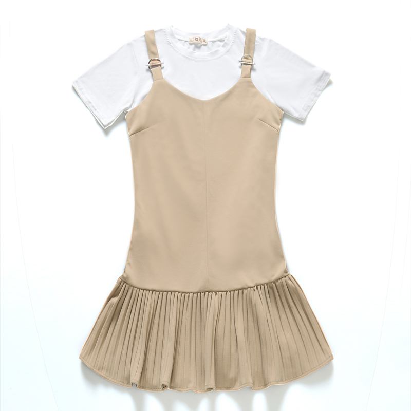 / 夏季套裝女時尚兩件套新款韓版小香風短袖T恤+百褶吊帶連衣裙
