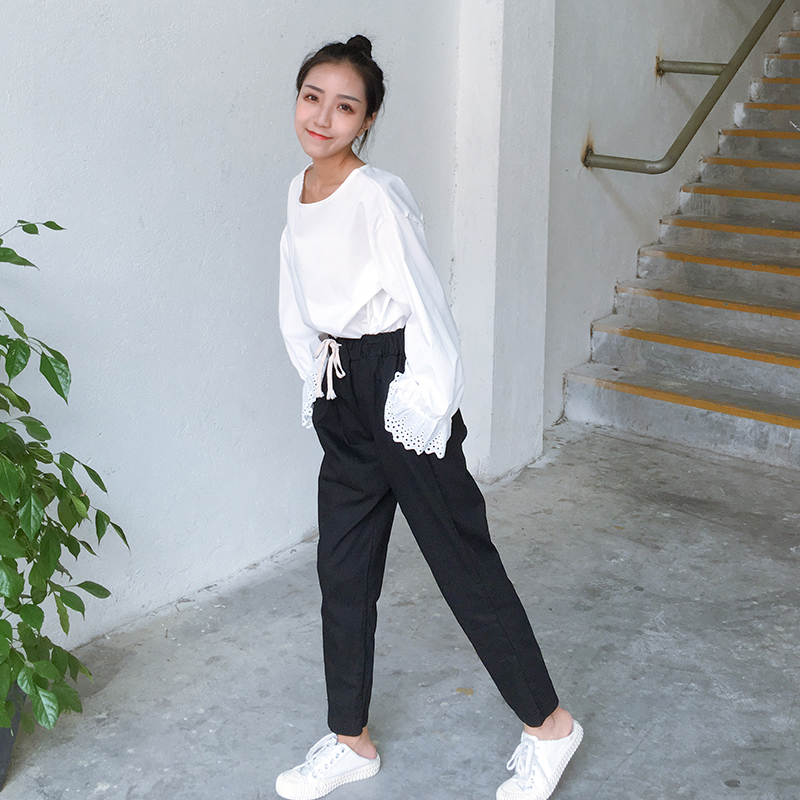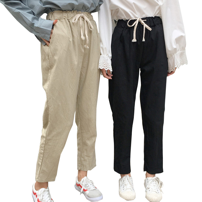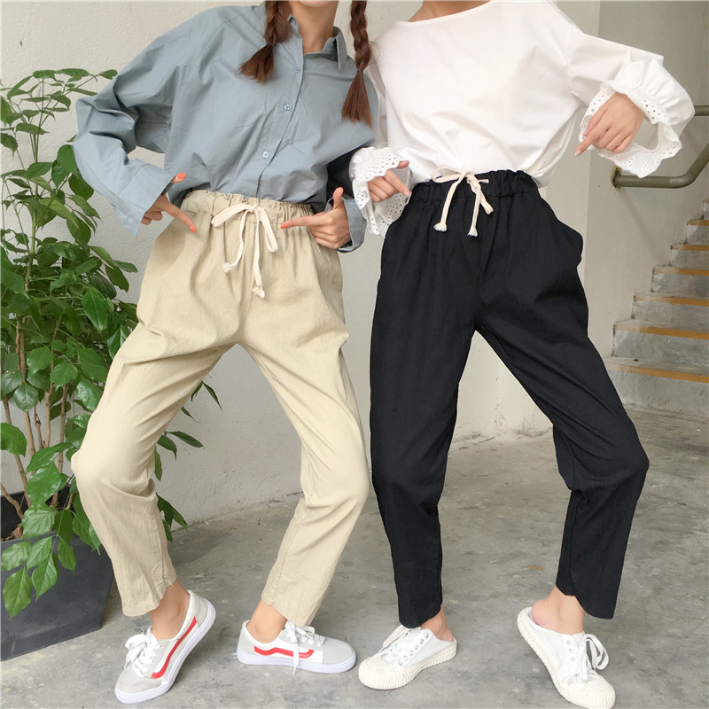 / 秋裝女裝韓版寬松顯瘦松緊腰系帶哈倫褲九分褲直筒褲學生休閑褲潮
