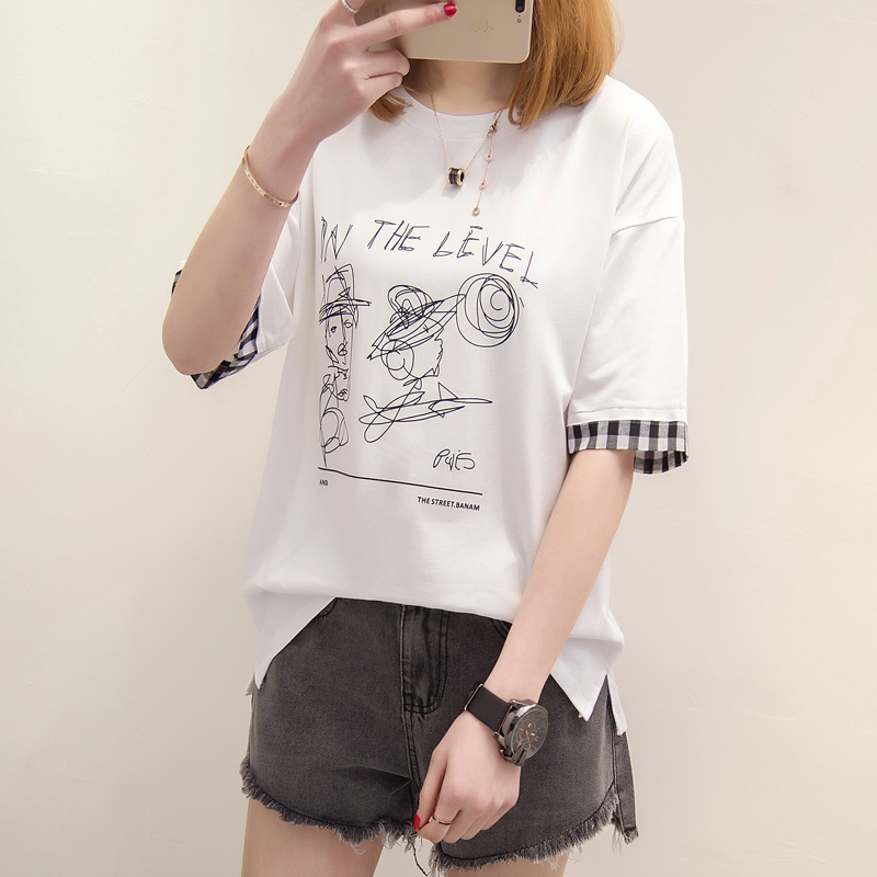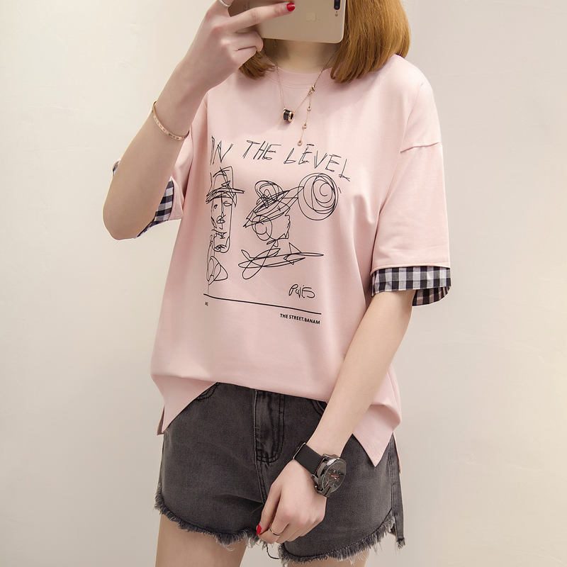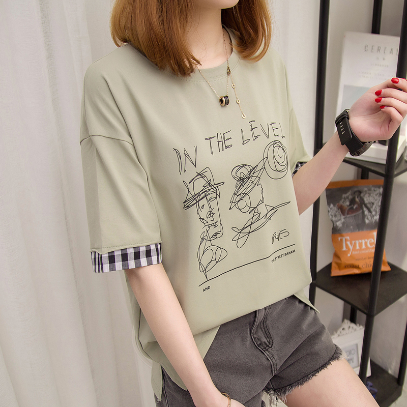 短袖t恤上衣女夏新款寬松拼接字母百搭中長袖韓版打底百搭潮