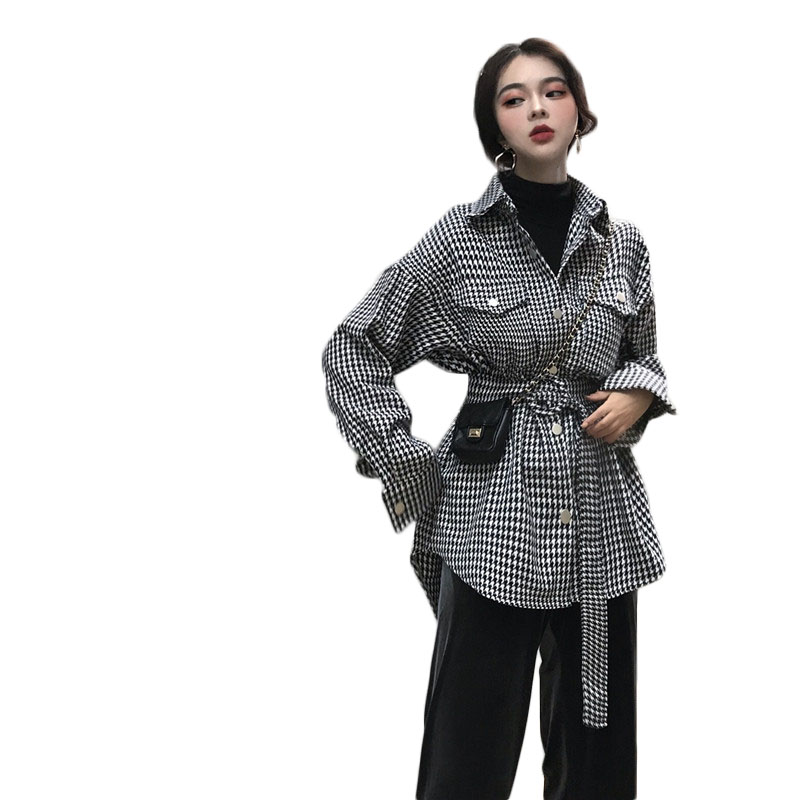 / 韓版慵懶風chic收腰格子毛呢外套女秋冬2018新款千鳥格中長款大衣