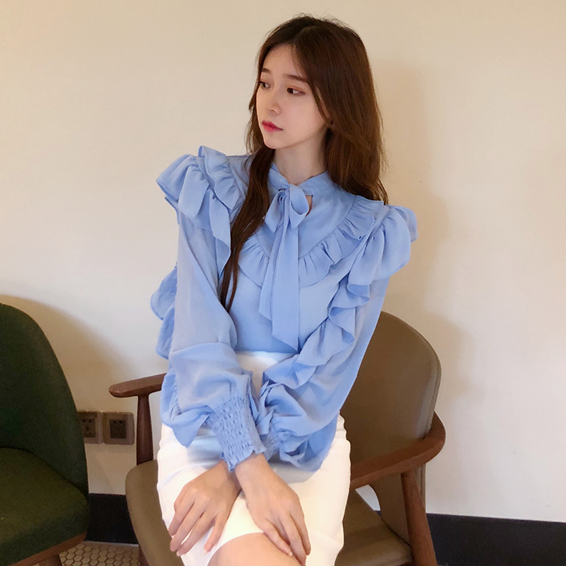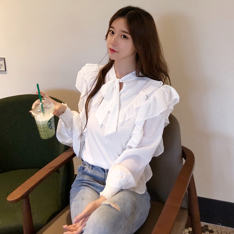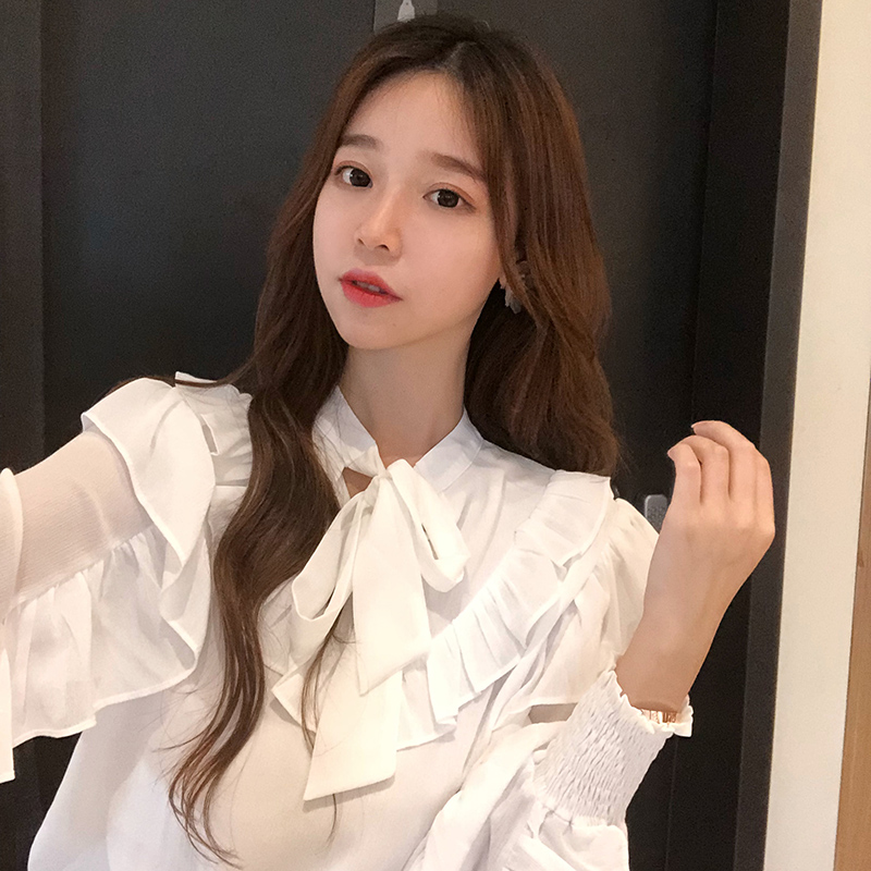 秋裝女2018新款韓版氣質小清新荷葉邊白襯衫休閑系帶泡泡長袖上衣
