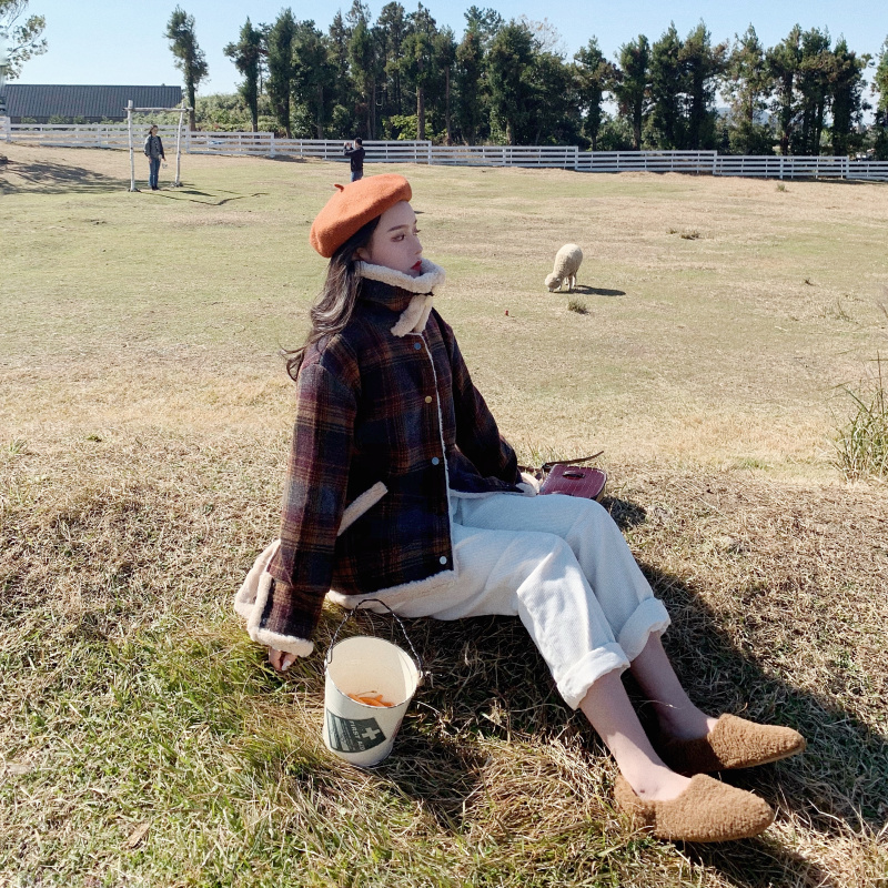 / 加厚復古chic加絨毛呢格子羊羔毛短款外套女秋冬2018新款棒球服潮