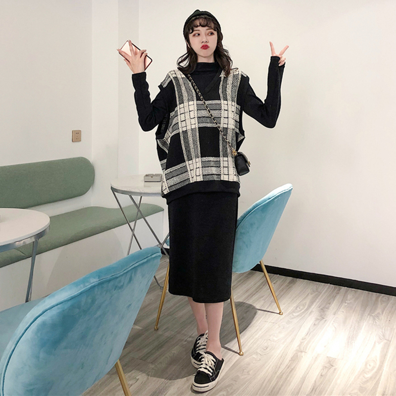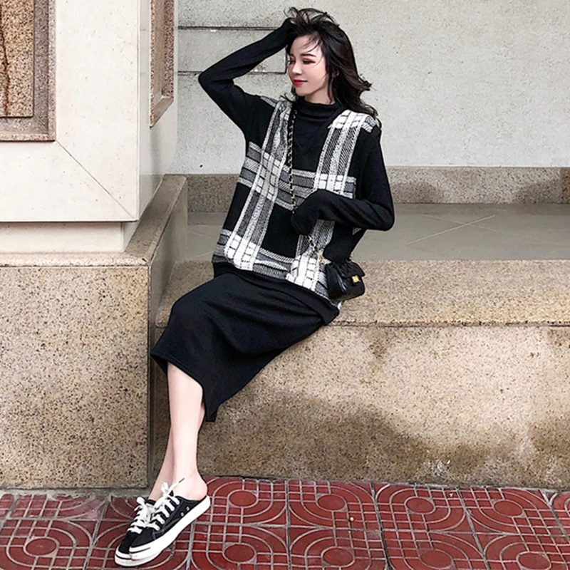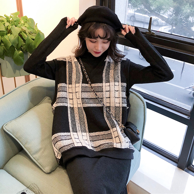 / 時尚套裝女秋冬新款復古格子V領毛呢馬甲外套高領修身針織連衣裙