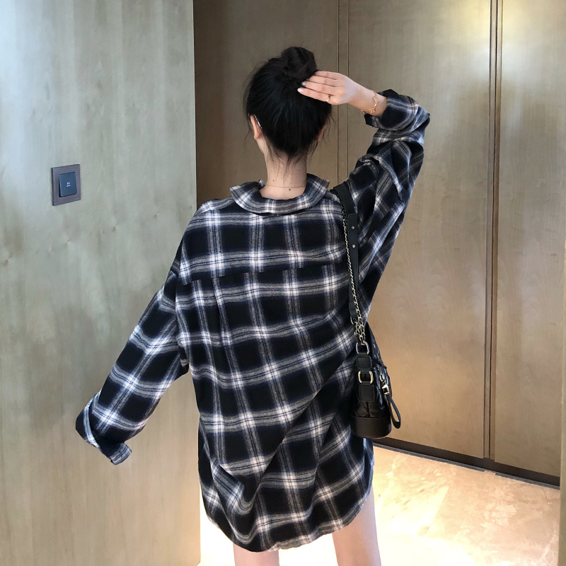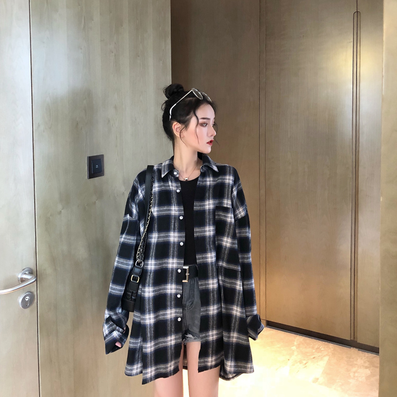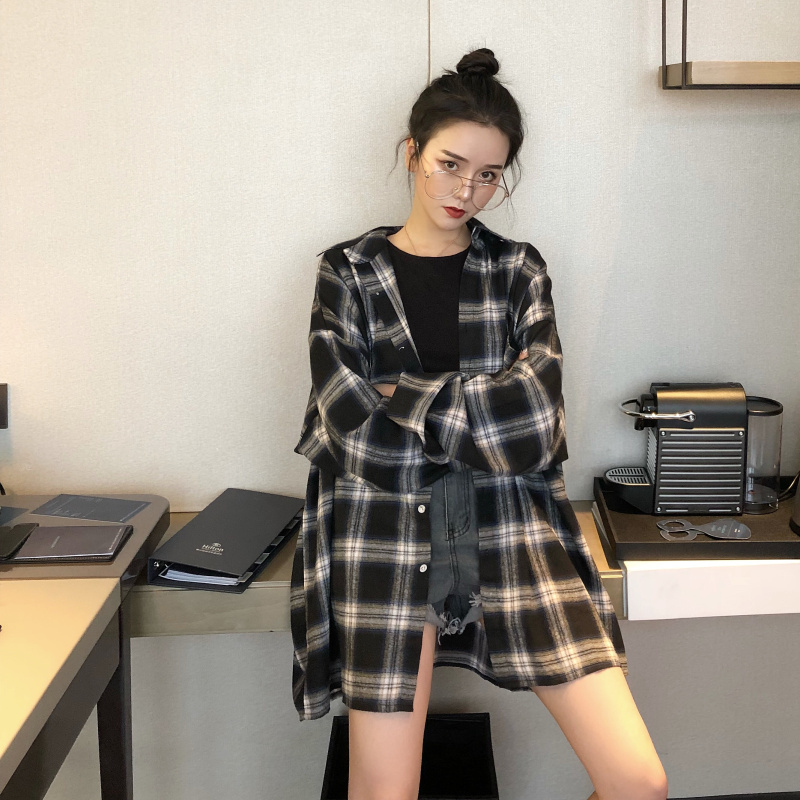 / 韓版時尚中長款格子襯衫薄寬松港風春秋長袖襯衣外套女裝2018新款