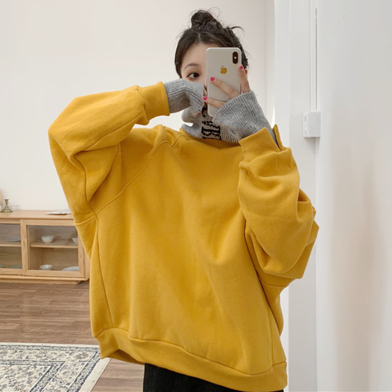 / 女冬裝2018新款寬松加絨套頭衛衣假兩件字母針織拼接高領撞色外套