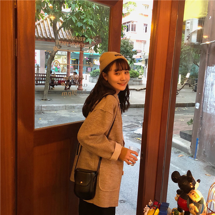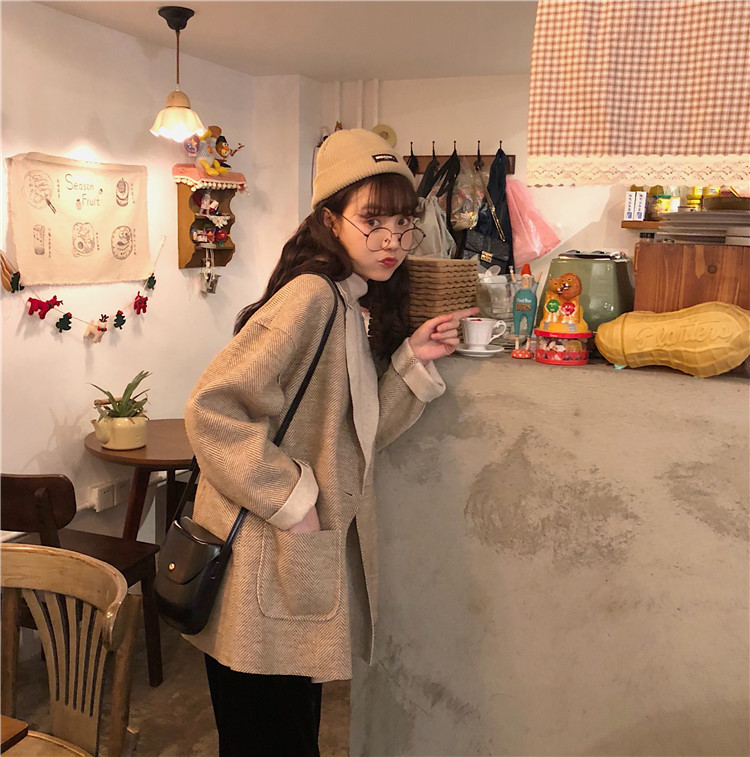 復古溫柔慵懶風隨意暖色系百搭寬松中長款毛呢外套女韓版呢子大衣