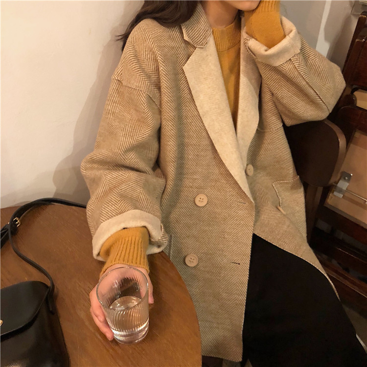 韓國百搭寬松中長款雙排扣中長款毛呢大衣復古西裝領上衣外套女潮