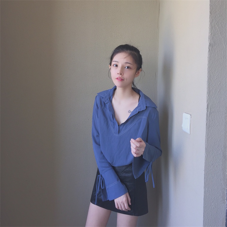 秋裝女2018新款chic早秋襯衫系帶喇叭袖韓范學生修身長袖襯衣女