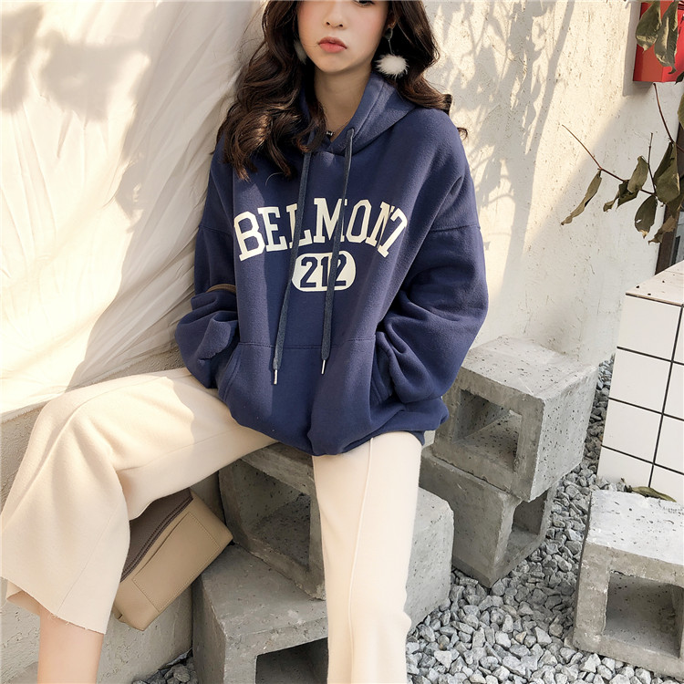 / 港味復古新款百搭顯瘦百搭BF風寬松印花下擺不對稱加絨衛衣上衣女