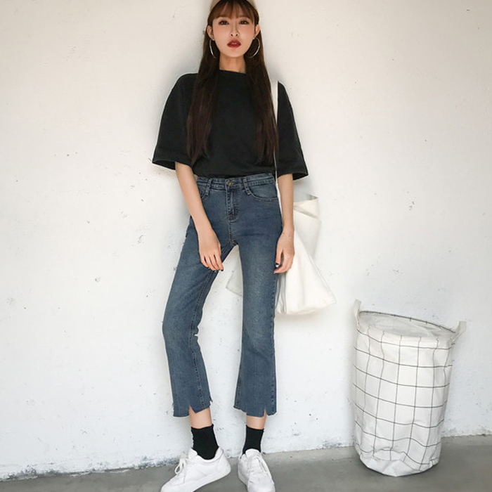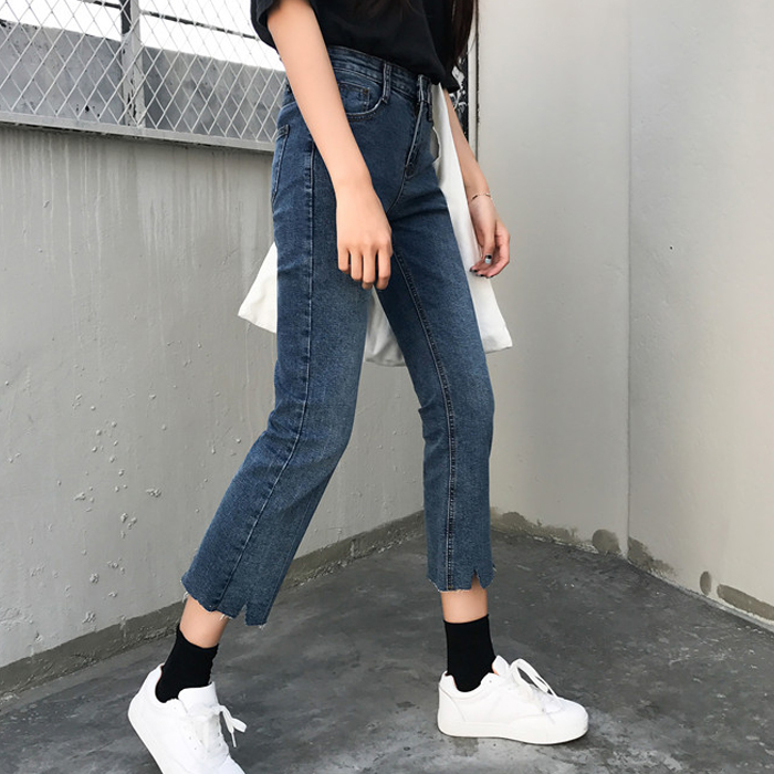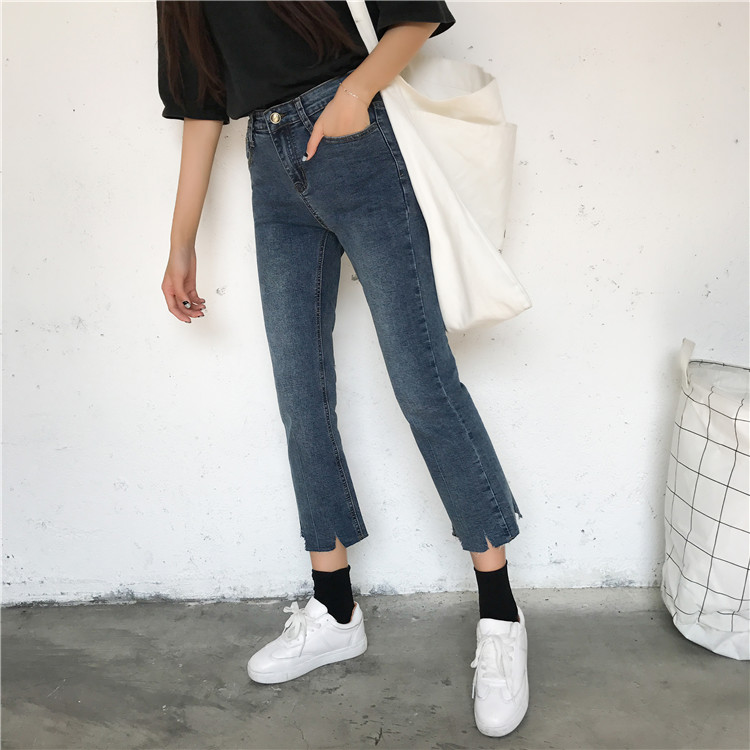/ 秋裝女裝新款韓版百搭顯瘦微喇叭褲個性缺口牛仔褲高腰九分褲長褲